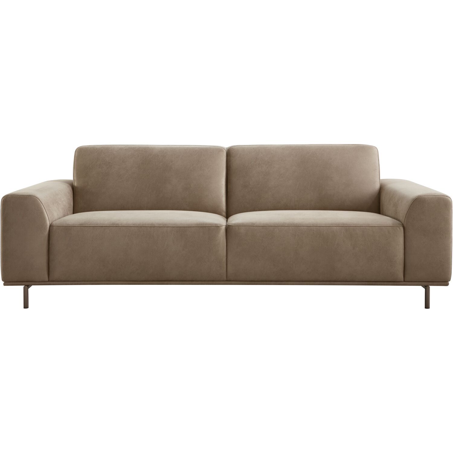 Deze bank heeft een luxe en moderne uitstraling. Het warmbruine microleder geeft het ontwerp een rijke look, waarbij de subtiele gouden gloed zorgt voor mooie diepte in de kleur. De plint is uitgevoerd in hetzelfde microleder, waardoor een rustig en verfijnd geheel ontstaat. De warm bruin metalen poten geven het ontwerp een elegant accent.
