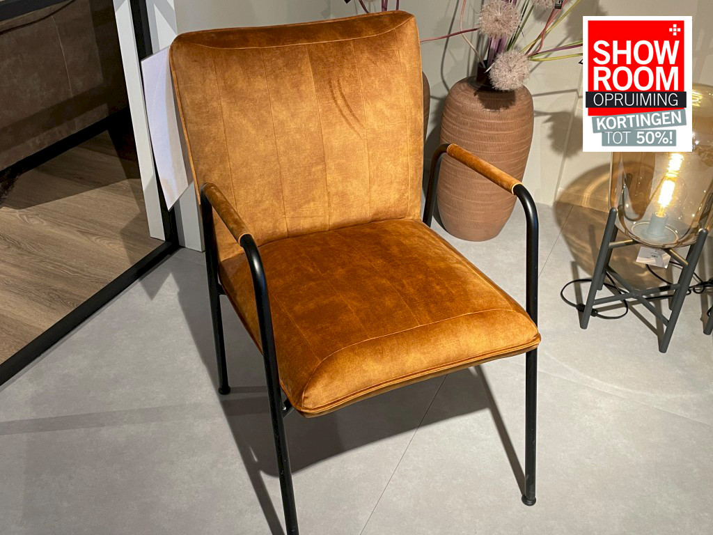 Uitgevoerd in stof Torre 10 met meekleurend stiksel in combinatie met zwarte metalen poten.