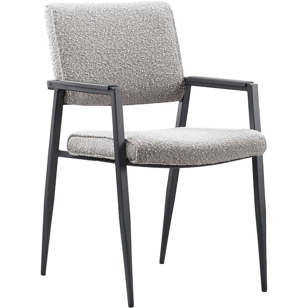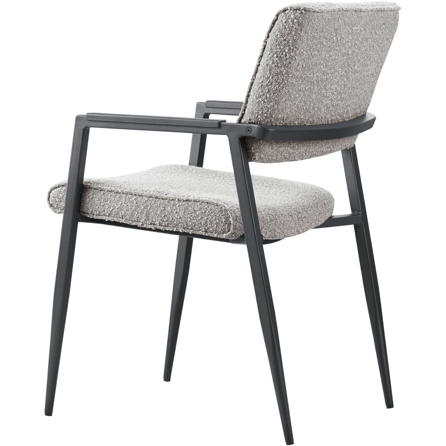 Stoel Jisca is uitgevoerd in stof touch in de kleur rhino. Stof touch is een geweven boucléstof en voelt zacht aan. De combinatie van de zachte stof en het zwart metalen frame, dat met strakke lijnen doorloopt in de armleuningen, geven de stoel een moderne uitstraling. De armleuningen zijn voorzien van zwart kunststof voor extra armcomfort.