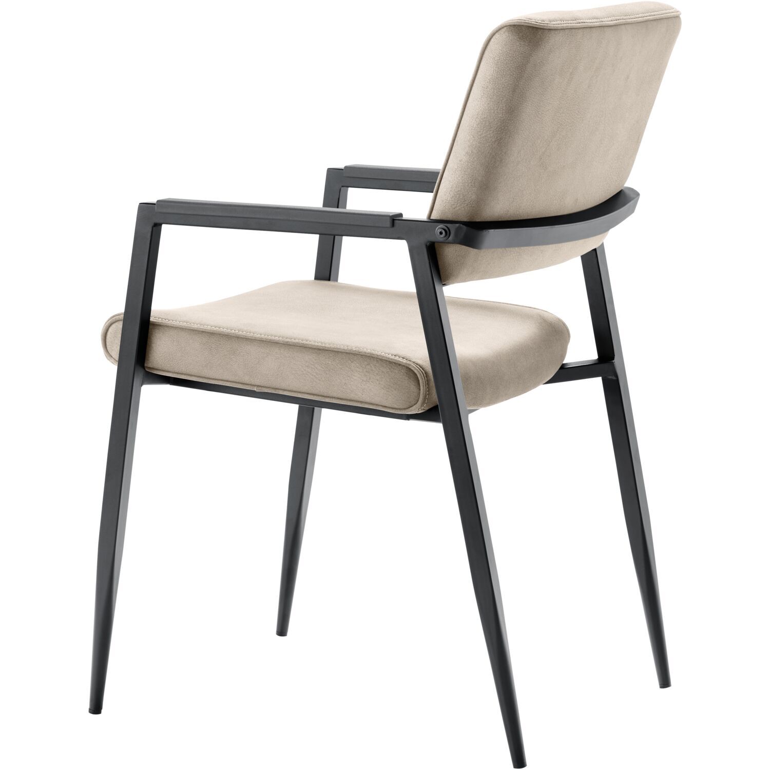 De stoel is voorzien van polyetherschuim in de zitting en rug, dit zorgt voor een wat steviger zitcomfort. De rugleuning, die door het zwart metalen frame met de zitting verbonden is, loopt iets schuin naar achteren. De pootjes lopen taps toe naar onderen, waardoor het frame een ranke uitstraling heeft. De armleuningen zijn voorzien van kunststof armleggers en zijn ca. 65 cm hoog.