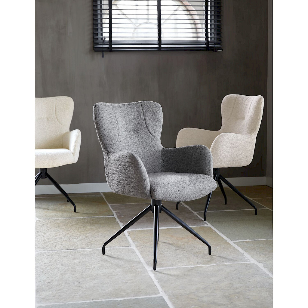 De zitting van de Lembo is uitgevoerd met polyetherschuim, een materiaal dat bekend staat om zijn praktische en comfortabele eigenschappen. Het biedt een prettige basis voor dagelijks gebruik en behoudt goed zijn vorm. Zo kun je ontspannen genieten, met de wetenschap dat deze armstoel is ontworpen met een maximale belasting van 120 kg. De stoel staat op een stevige zwarte kruispoot, die niet alleen zorgt voor een moderne uitstraling maar ook is uitgerust met een 360-graden terugdraaifunctie voor extra gebruiksgemak. Met een breedte van 61 cm is de stoel perfect geschikt voor aan de eettafel.