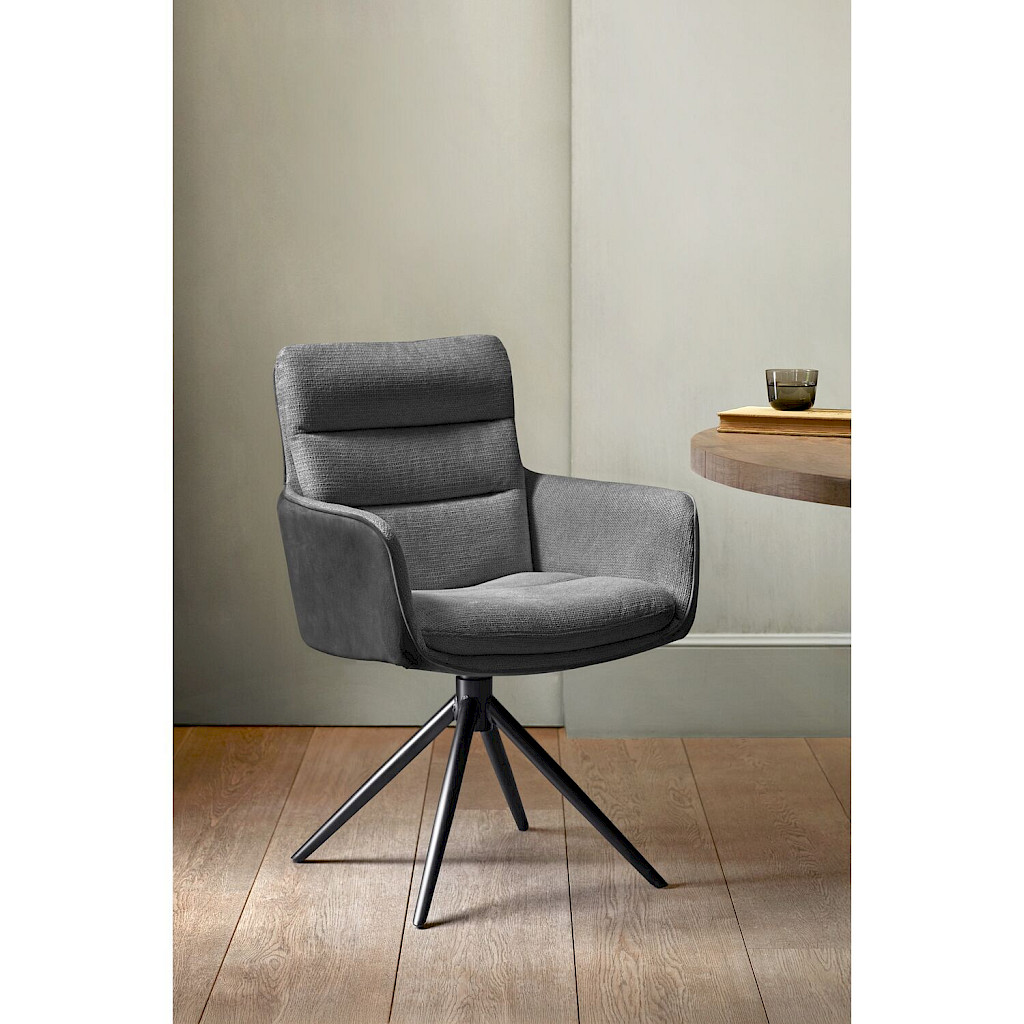 De buitenzijde van armstoel Letta is bekleed met een zachte velvetstof. Door de lichtinval op de vezels ontstaat een speels en luxueus kleureffect. De binnenzijde is uitgevoerd in een meerkleurige weefstof met een subtiele, zachte structuur. Samen zorgen deze stoffen, in stijlvolle donkergrijze tinten, voor een luxe en uitnodigende uitstraling. De zwart metalen poot voegt daar een modern accent aan toe.