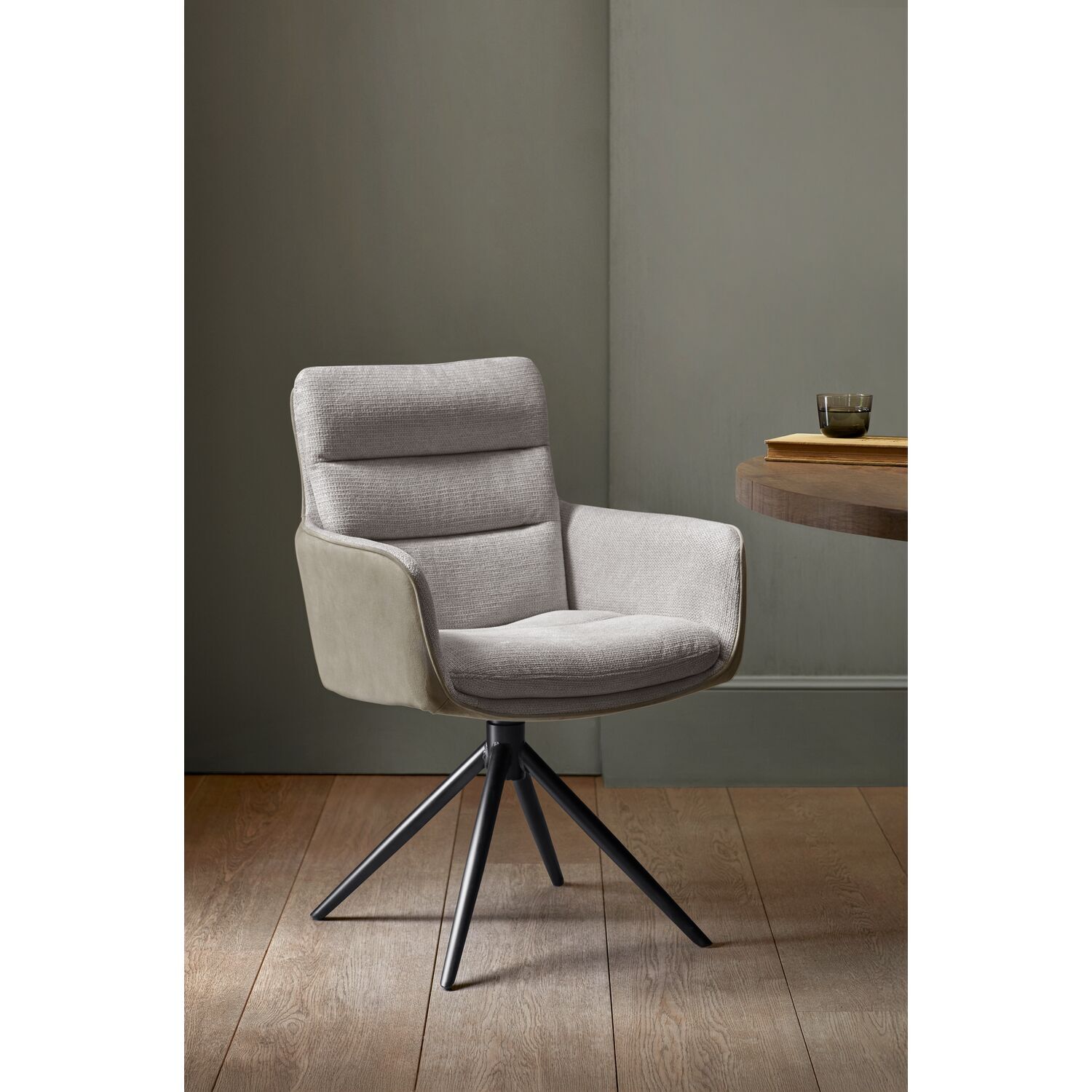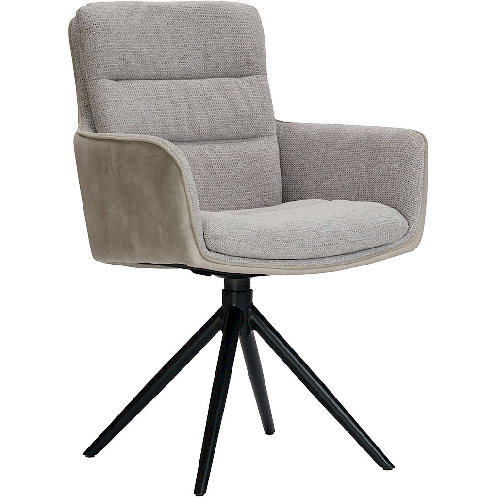 De buitenzijde van armstoel Letta is bekleed met een zachte velvetstof. Door de lichtinval op de vezels ontstaat een speels en luxueus kleureffect. De binnenzijde is uitgevoerd in een meerkleurige weefstof met een subtiele, zachte structuur. Samen zorgen deze stoffen, in verfijnde lichtgrijze tinten, voor een frisse en serene uitstraling. De zwart metalen poot voegt daar een modern accent aan toe.