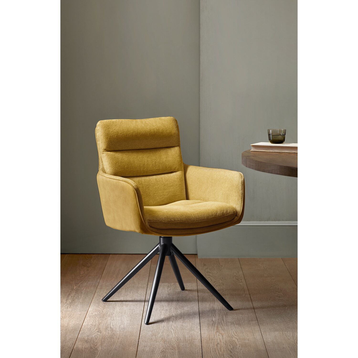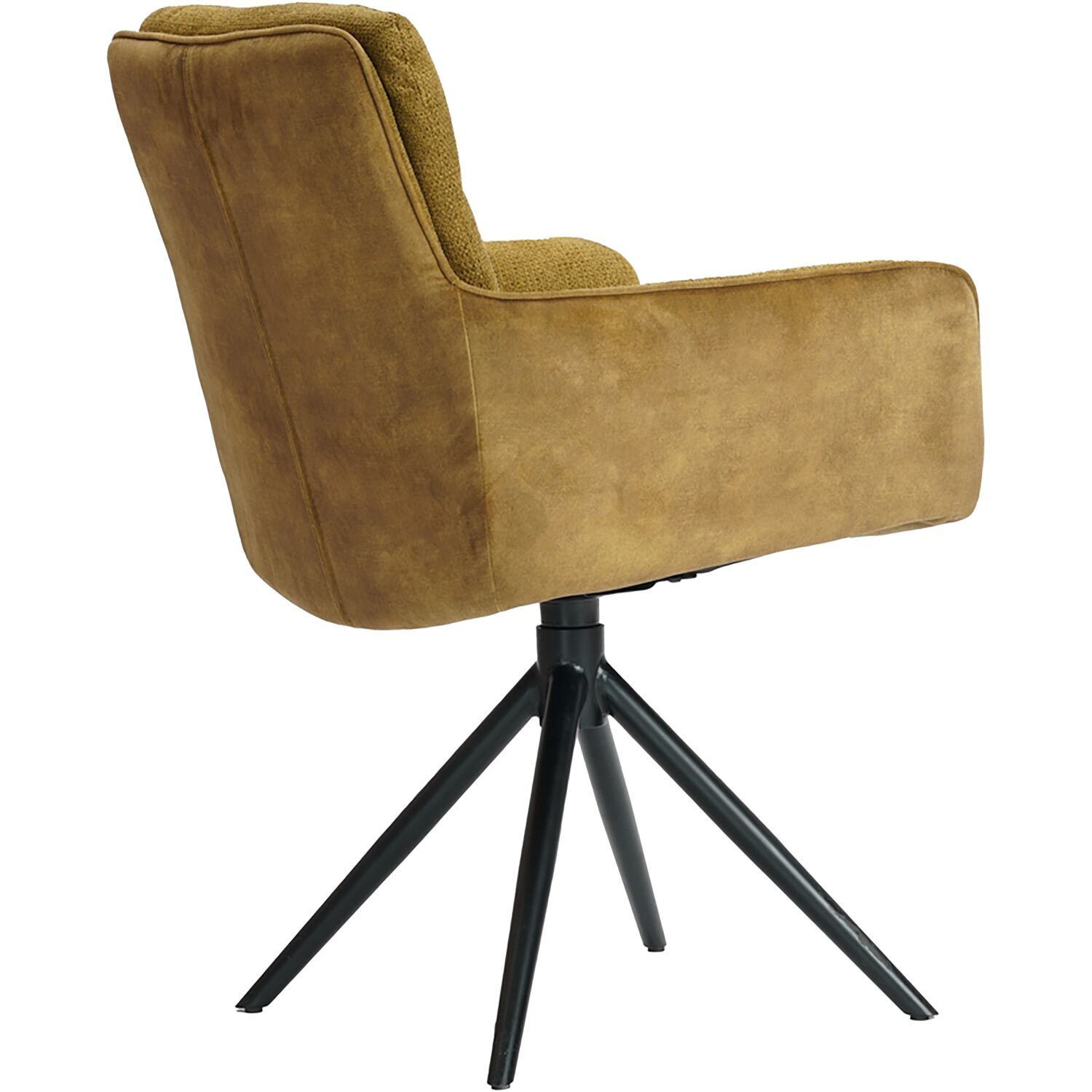 De buitenzijde van armstoel Letta is bekleed met een zachte velvetstof. Door de lichtinval op de vezels ontstaat een speels en luxueus kleureffect. De binnenzijde is uitgevoerd in een meerkleurige weefstof met een subtiele, zachte structuur. Samen zorgen deze stoffen, in warm okergeel, voor een warme en nazomerse sfeer. De zwart metalen poot voegt daar een modern accent aan toe.
