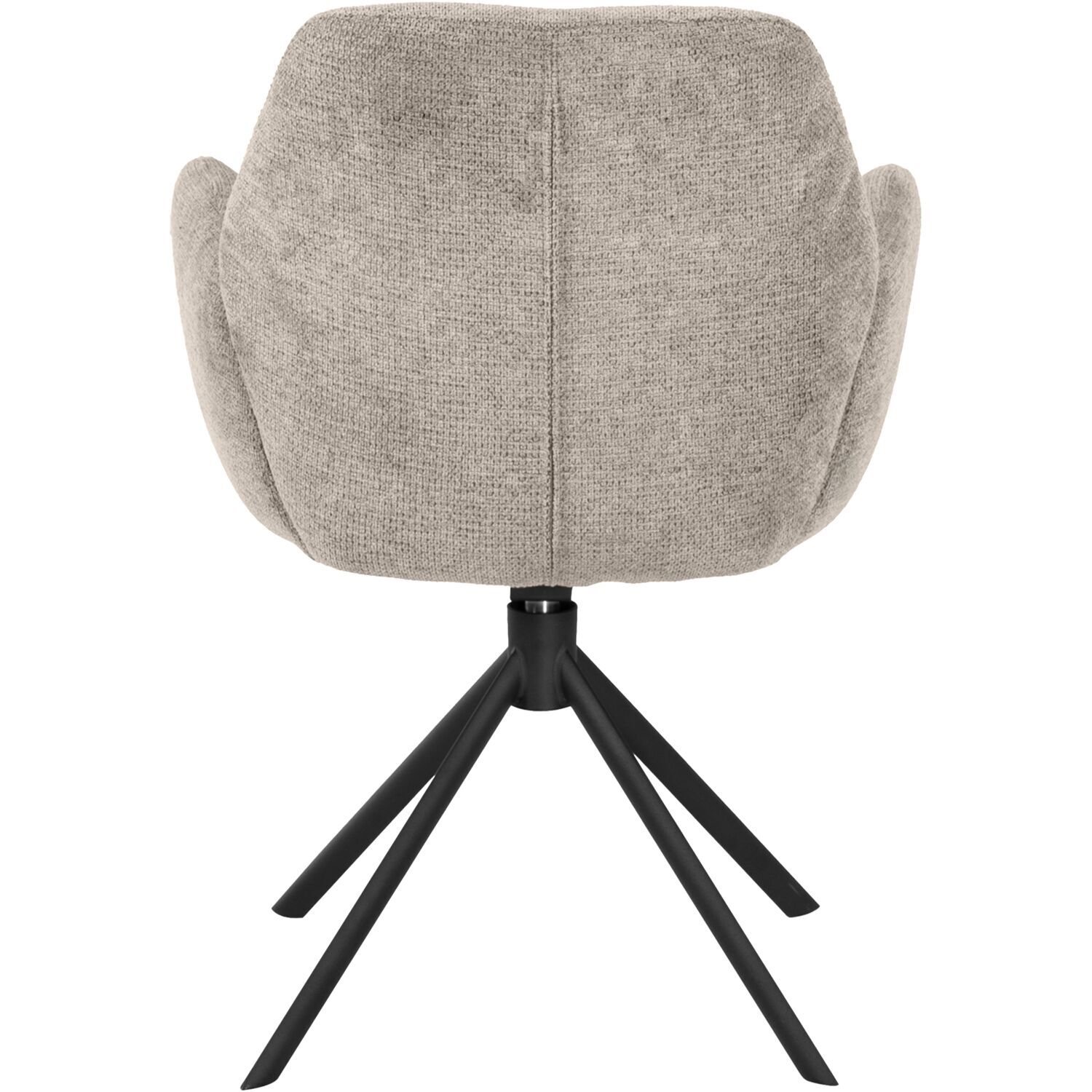 Armstoel Loranzo is uitgevoerd met een fijne, geweven stof in een stijlvolle grijze tint. De stof voelt zacht aan en geeft de stoel een rustige en stijlvolle uitstraling. Een subtiel sierstiksel in de rugleuning voegt een verfijnd detail toe. Doordat zowel de binnen- als buitenzijde in dezelfde stof is uitgevoerd, ontstaat een rustige, harmonieuze look die mooi past in diverse interieurs. De zwarte metalen draaipoot geeft de stoel een modern accent.