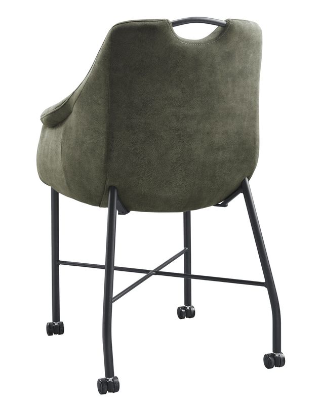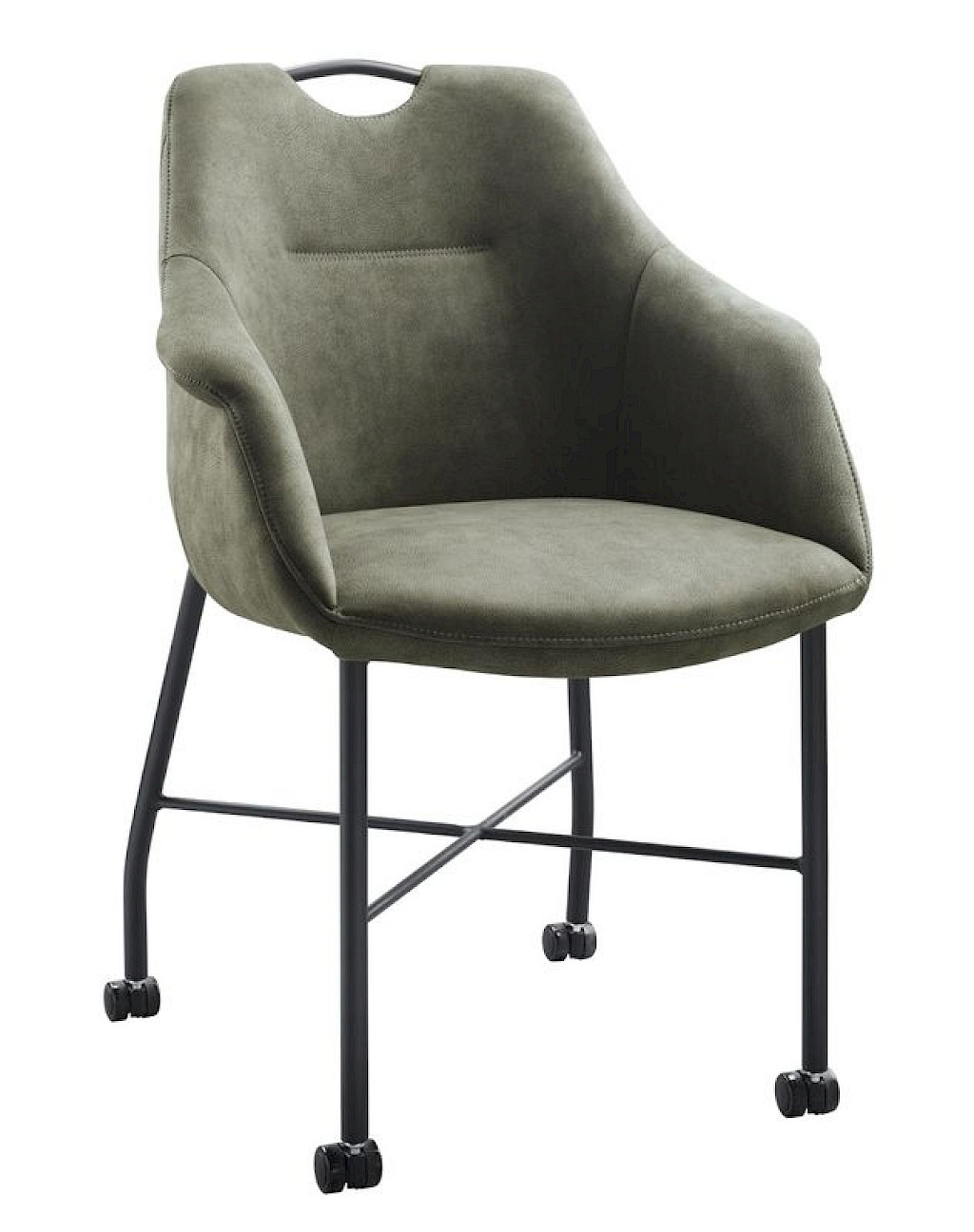 Uitgevoerd in microvezelstof luxor moss met polyetherschuim in de zitting en de rug en handgreep, zwarte metalen poten en wieltjes.