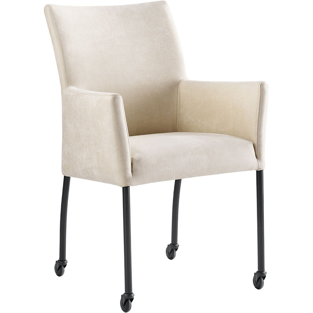 Sessione is een ranke eetkamerstoel met armleuningen met een elegante uitstraling. De stoel is bekleed met ecru-kleurig microleder, dit is een samengestelde bekleding bestaande uit een stevige onderlaag van leer en een toplaag van microvezelstof. Dit heeft een luxe, wat stoerdere uitstraling, en voelt toch lekker zacht aan. Dankzij de zwarte wieltjes is de stoel eenvoudig en snel te verplaatsen. Op de achterzijde van de rugleuning zit een ritssluiting in dezelfde kleur als de stof.