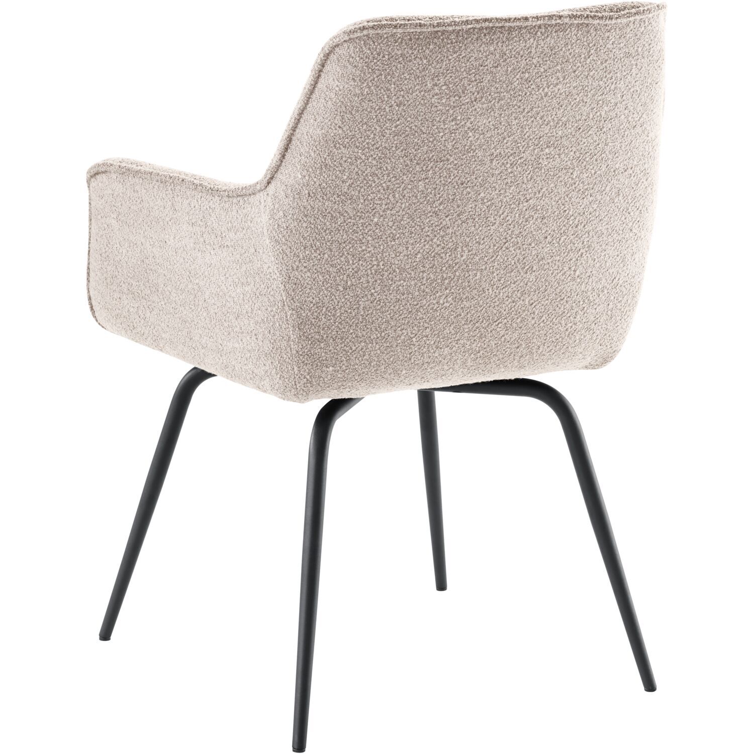 Dit model is een comfortabele en stijlvolle armstoel met een zachte uitstraling. De stoel is bekleed met een bouclé stof in de kleur beige. Bouclé stof bestaat uit los geweven patronen, draden en lussen. Ondanks de onregelmatige structuur die hierdoor ontstaat, voelt de stof lekker zacht en warm aan. De vlindernaad en ronde zwart metalen poten geven de stoel een moderne uitstraling.