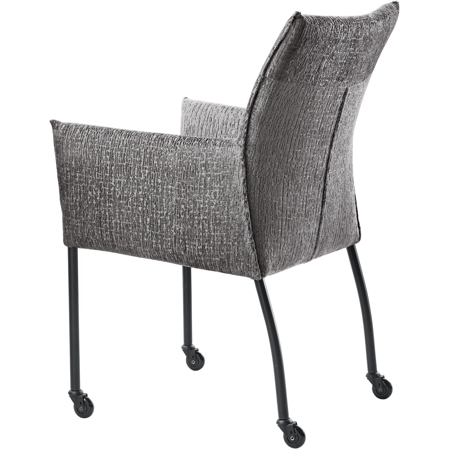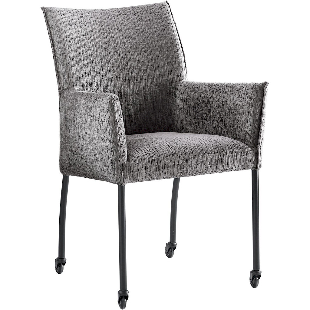 Vitale is een ranke eetkamerstoel met armleuningen met een elegante uitstraling. De stoel is uitgevoerd in een zware en stevige kwaliteit chenille meubelstof met een licht 3D effect in een grijze kleur. De stof heeft een rijke en volumineuze uitstraling en voelt daarnaast nog eens heerlijk zacht aan. De stoel is standaard voorzien van een gesloten vlindernaad, dit accentueert de belijning van de eetkamerstoel. Dankzij de zwarte wieltjes is de stoel eenvoudig en snel te verplaatsen. Op de achterzijde van de rugleuning zit een ritssluiting in dezelfde kleur als de stof.