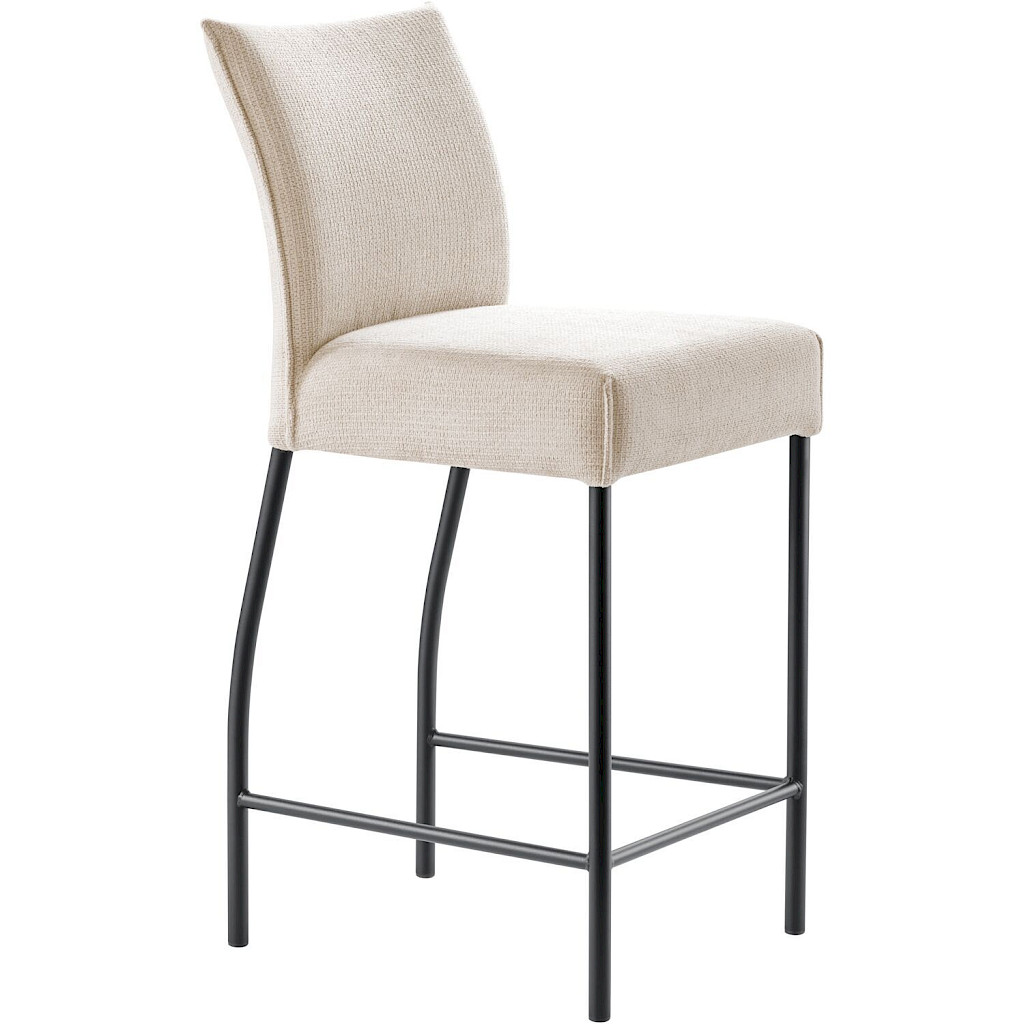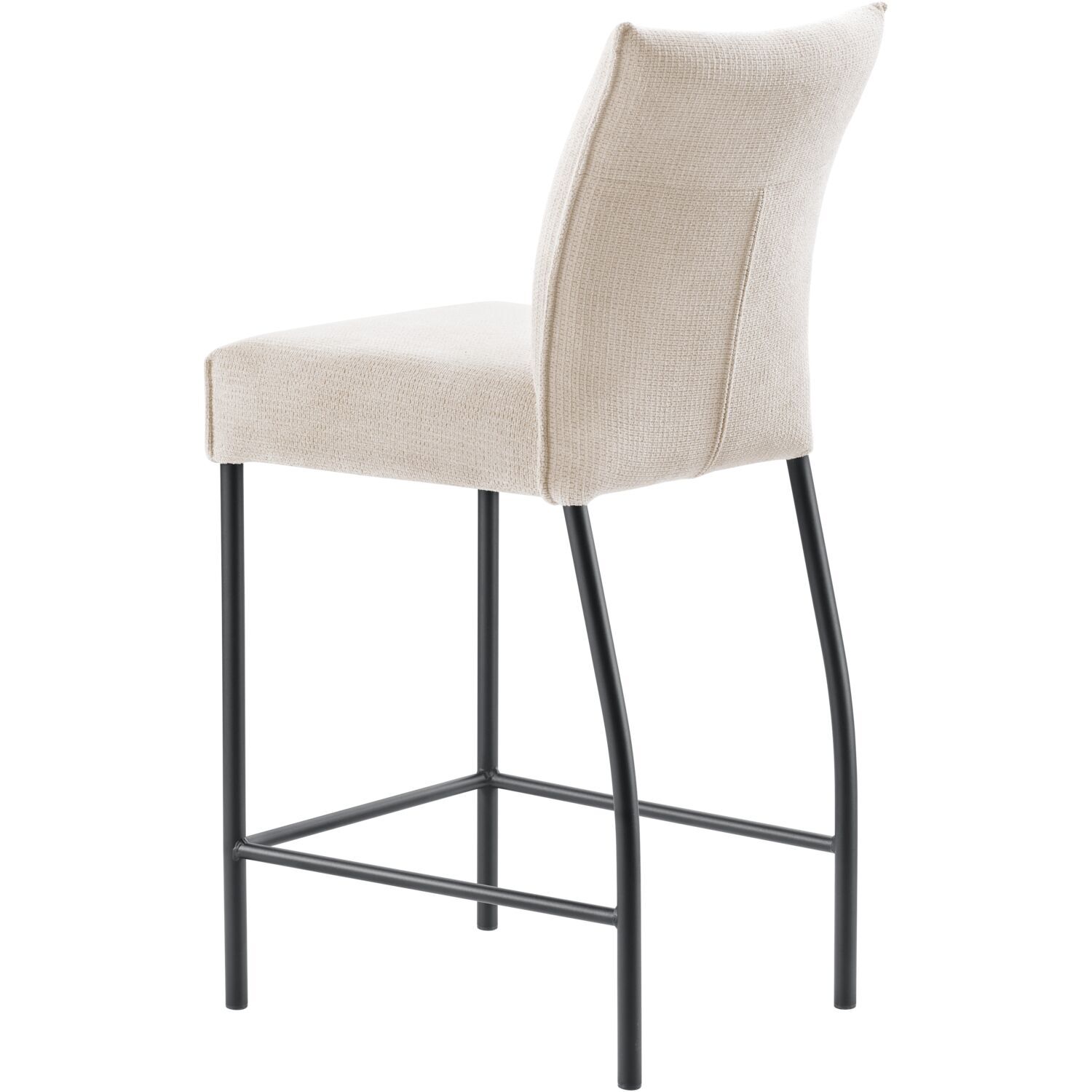 Vitale is een ranke barkruk met een elegante uitstraling. De kruk is uitgevoerd in een ecru-beige gemêleerde weefstof. Door het gebruik van verschillende garens en tinten ontstaat een licht meerkleurige kwaliteit met een ietwat grovere structuur die zacht en vol aanvoelt. De kruk is standaard voorzien van een gesloten vlindernaad en een zwart metalen poot, dit geheel accentueert de belijning.
