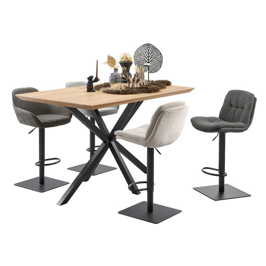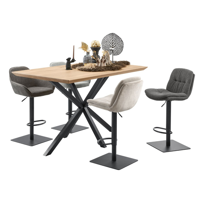 Deze uitvoering heeft een rechthoekig afgeschuind tafelblad van 160x90 cm in een lichte grijs-bruine kleur, en een zwart metalen spinpoot. De subtiele grijstint geeft de tafel een eigentijdse uitstraling, terwijl het eikenhout zorgt voor warmte en gezelligheid. De hoogte tot de onderkant van het blad is ca. 87 cm. Houd dit in de gaten als je barstoelen met armleuningen aan de tafel wilt zetten.