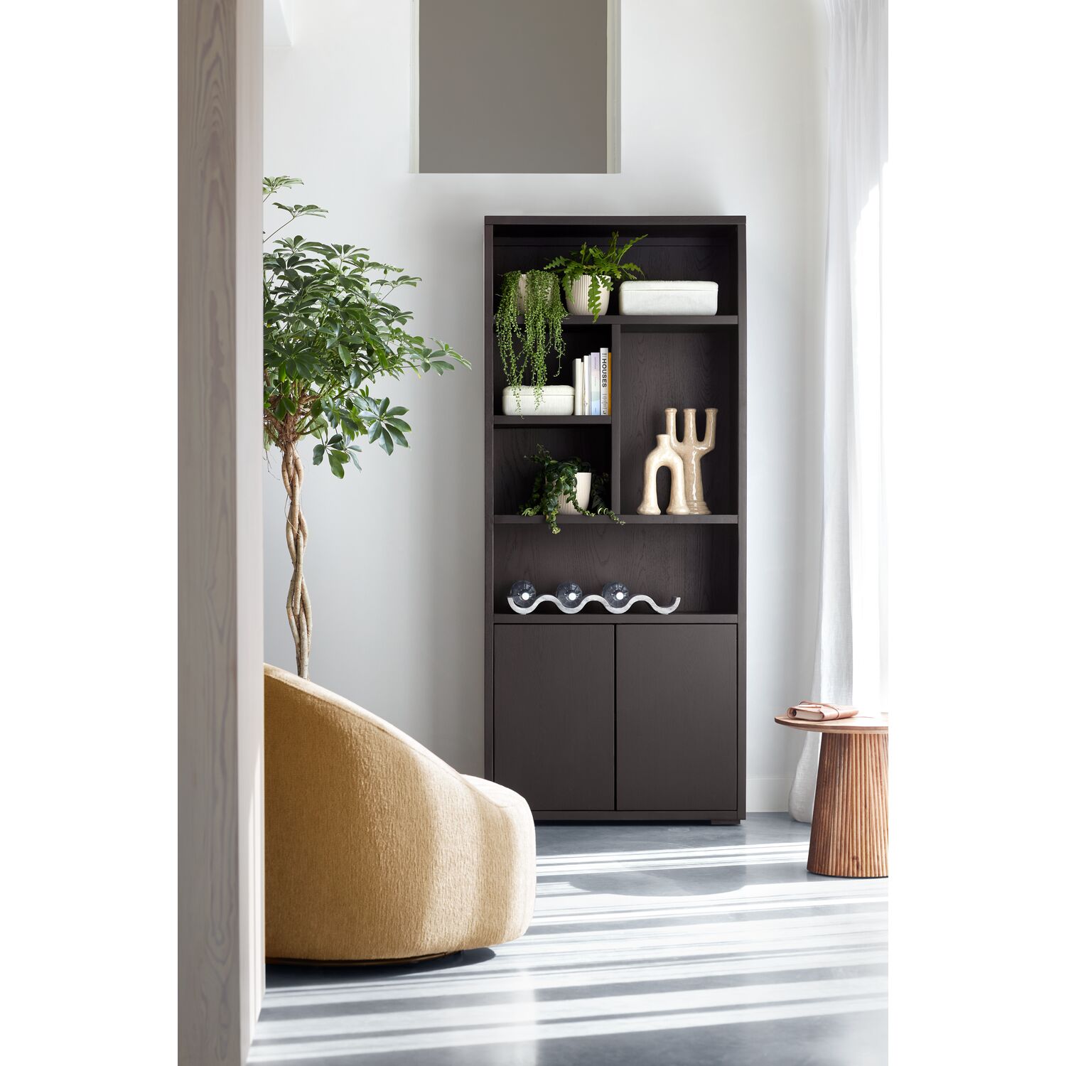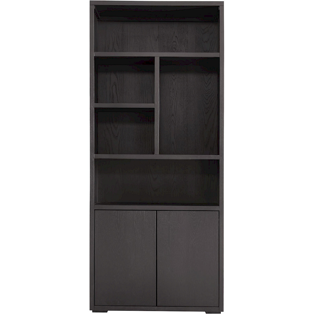 De kastenserie van Nerano is strak en tijdloos. Deze boekenkast is uitgevoerd in eiken fineer in de kleur nero en heeft 2 deuren en 5 open vakken. De eiken ombouw is gelakt, waardoor deze vriendelijk in onderhoud is.