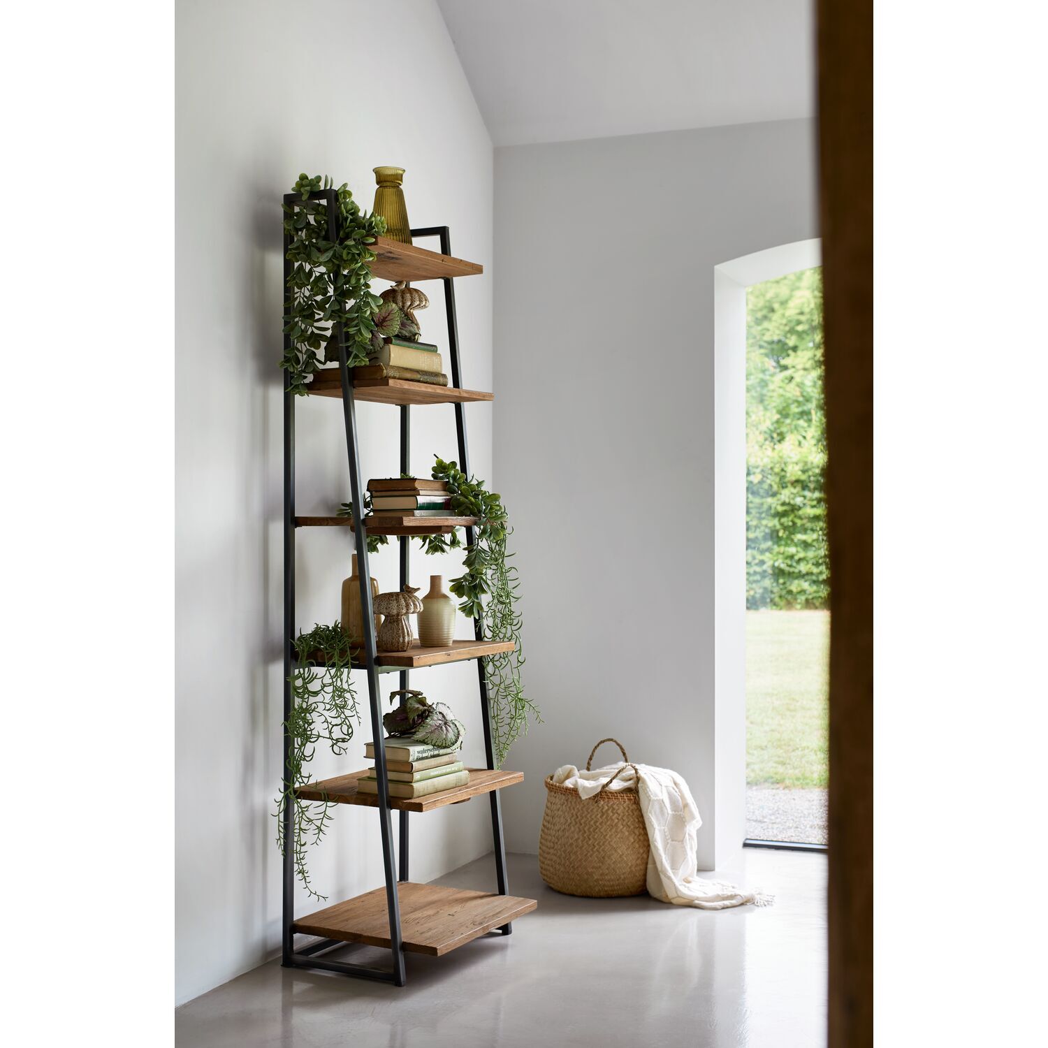 Dit stoere wandrek van teakhout is 190 cm hoog en 55 cm breed en heeft 6 legplanken. De open vakken zijn 30 cm hoog en 52 cm breed en de diepte van de legplanken zijn vanaf de hoogste plank naar de laagste plank: d26 - d30- d33 - d37 - d40 - d44 cm. Goed om te weten is dat dit rek voorgemonteerd is. Je kunt hem dus meteen een leuk plekje geven en er leuke woonaccessoires of foto¿s op presenteren.