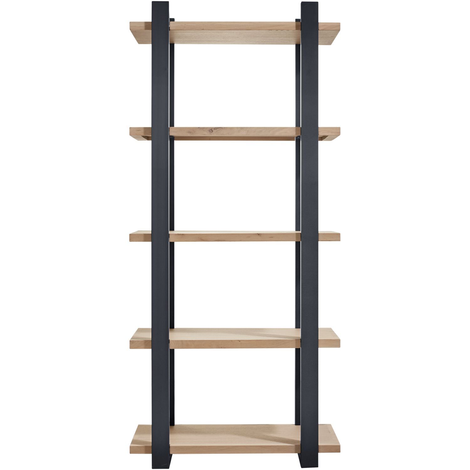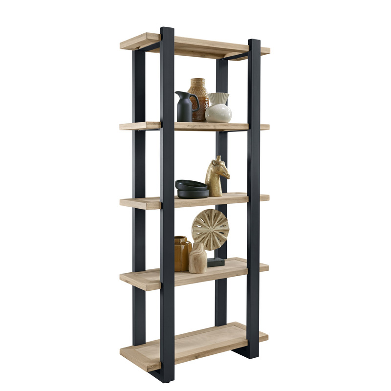 Uitgevoerd in robuust geborsteld eiken in de kleur 67.5 naturel grey, met 5 legplanken en RAL-7021 metalen frame. | Zelfmontage.