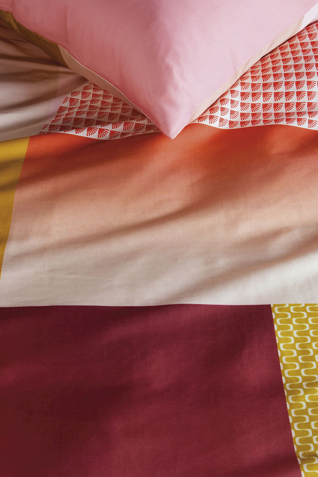 Het Sunset Boulevard dekbedovertrek van Beddinghouse Dutch Design heeft een opvallend ontwerp met cirkels, geometrische vlakken en textuurpatronen. De warme kleuren geven de slaapkamer een artistieke uitstraling. Draai het overtrek om voor een rustige effen achterzijde. Dit Nederlandse design maakt van het bed een echte blikvanger in de kamer.