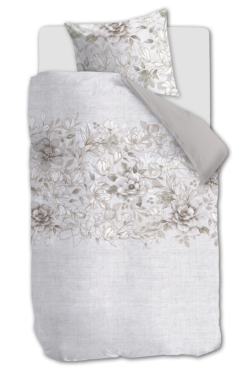 Dekbedovertrek Bernice van Rivièra Maison heeft aan de voorzijde een prachtige digitale print van fotobloemen, bladeren en getekende bloemen in verschillende tinten. De achterzijde is effen van kleur.