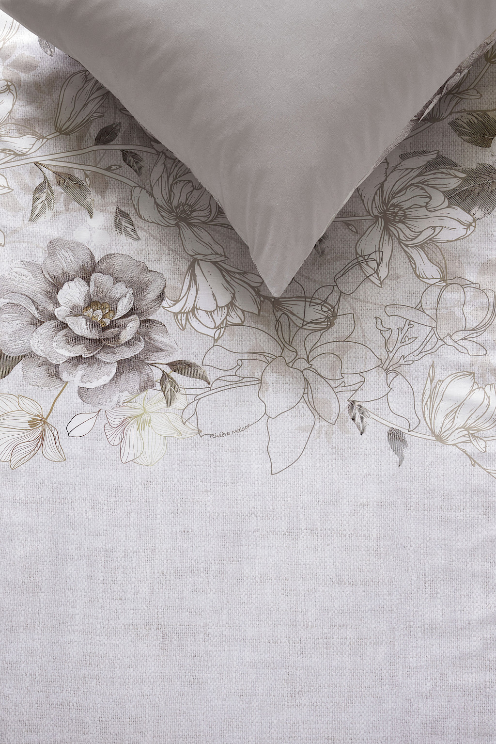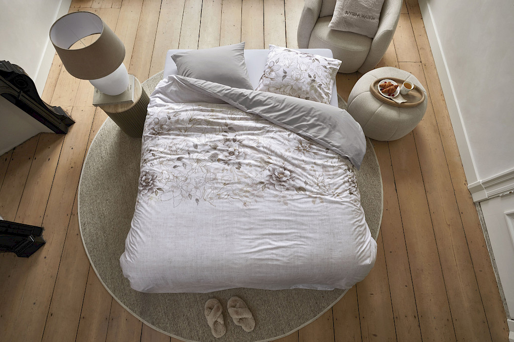 Dekbedovertrek Bernice van Rivièra Maison heeft aan de voorzijde een prachtige digitale print van fotobloemen, bladeren en getekende bloemen in verschillende tinten