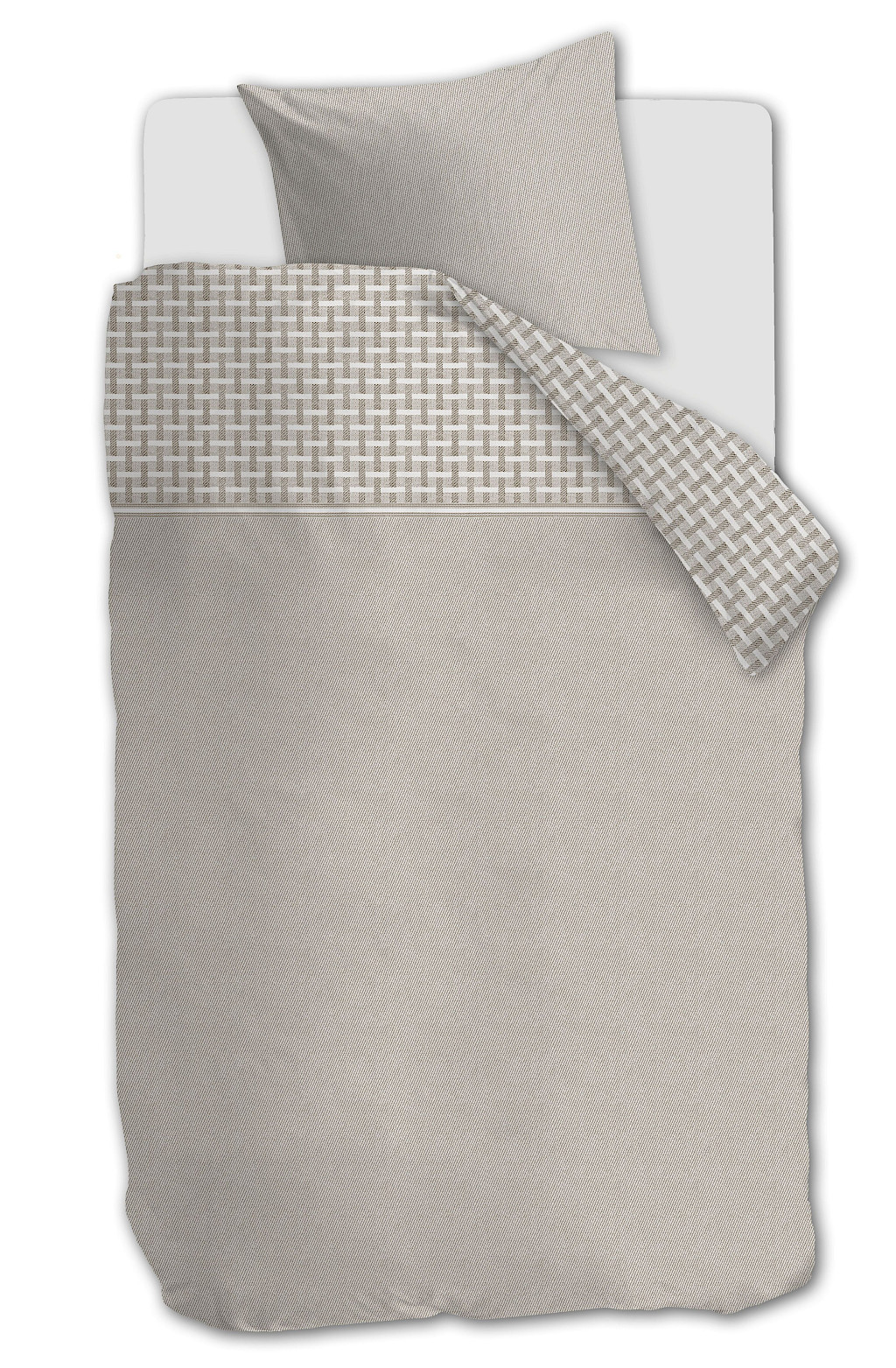 Dekbedovertrek Hayes van Rivièra Maison heeft een keperprint gecombineerd met een gevlochten baan bovenaan het overtrek. Tussen de lichte en donkere kleur zit een geprinte geweven band. Zowel de voor- als achterkant van het overtrek zijn hetzelfde.