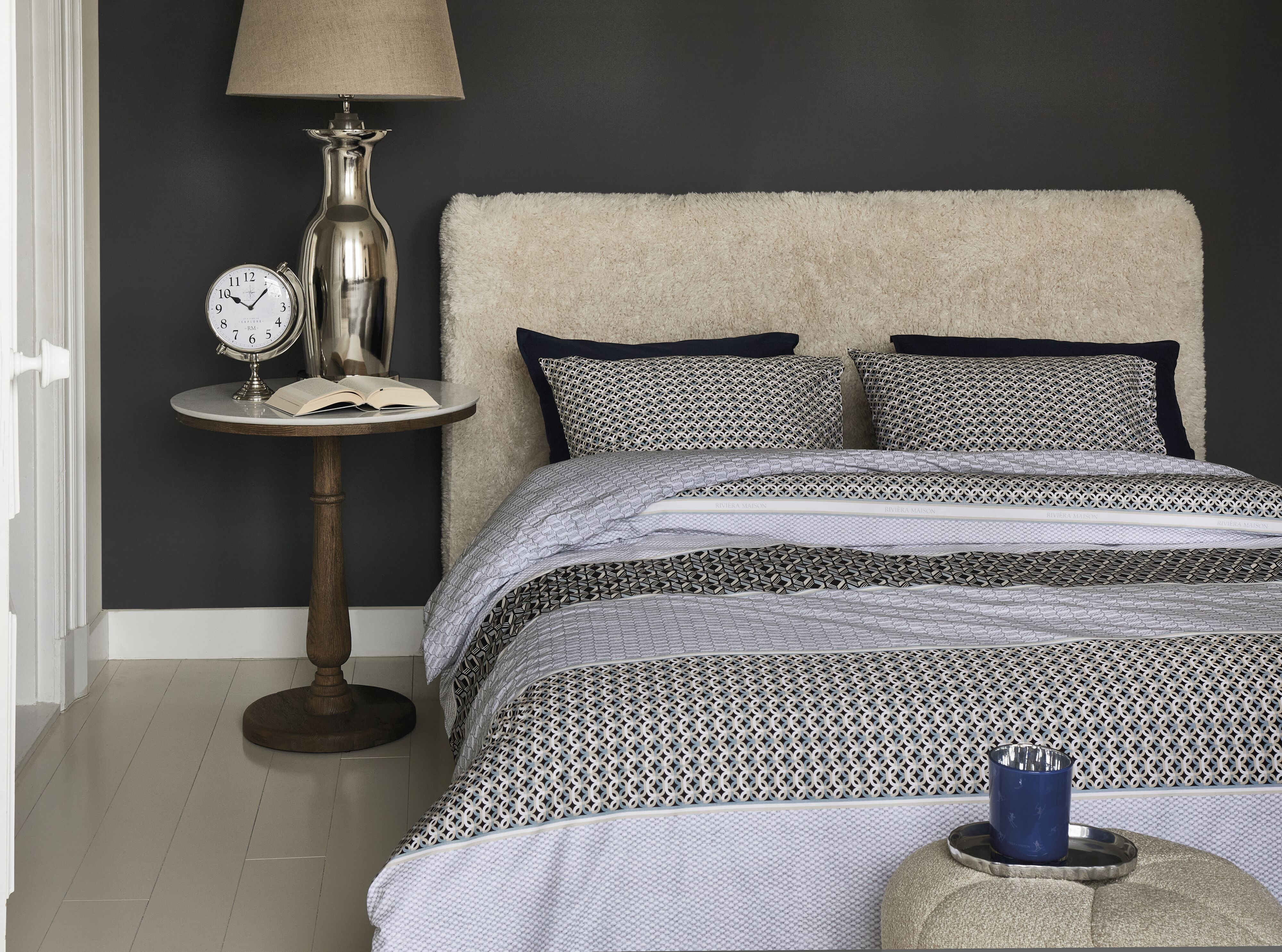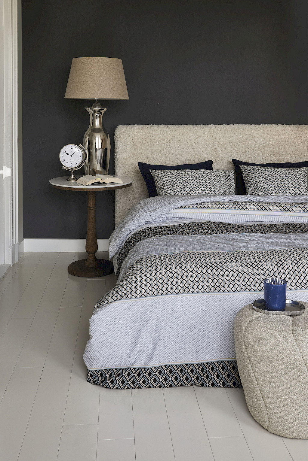 Dekbedovertrek Lawrence van Rivièra Maison heeft een print van een tijdloos banendessin, opgebouwd met verschillende weefmotieven en stofstructuren