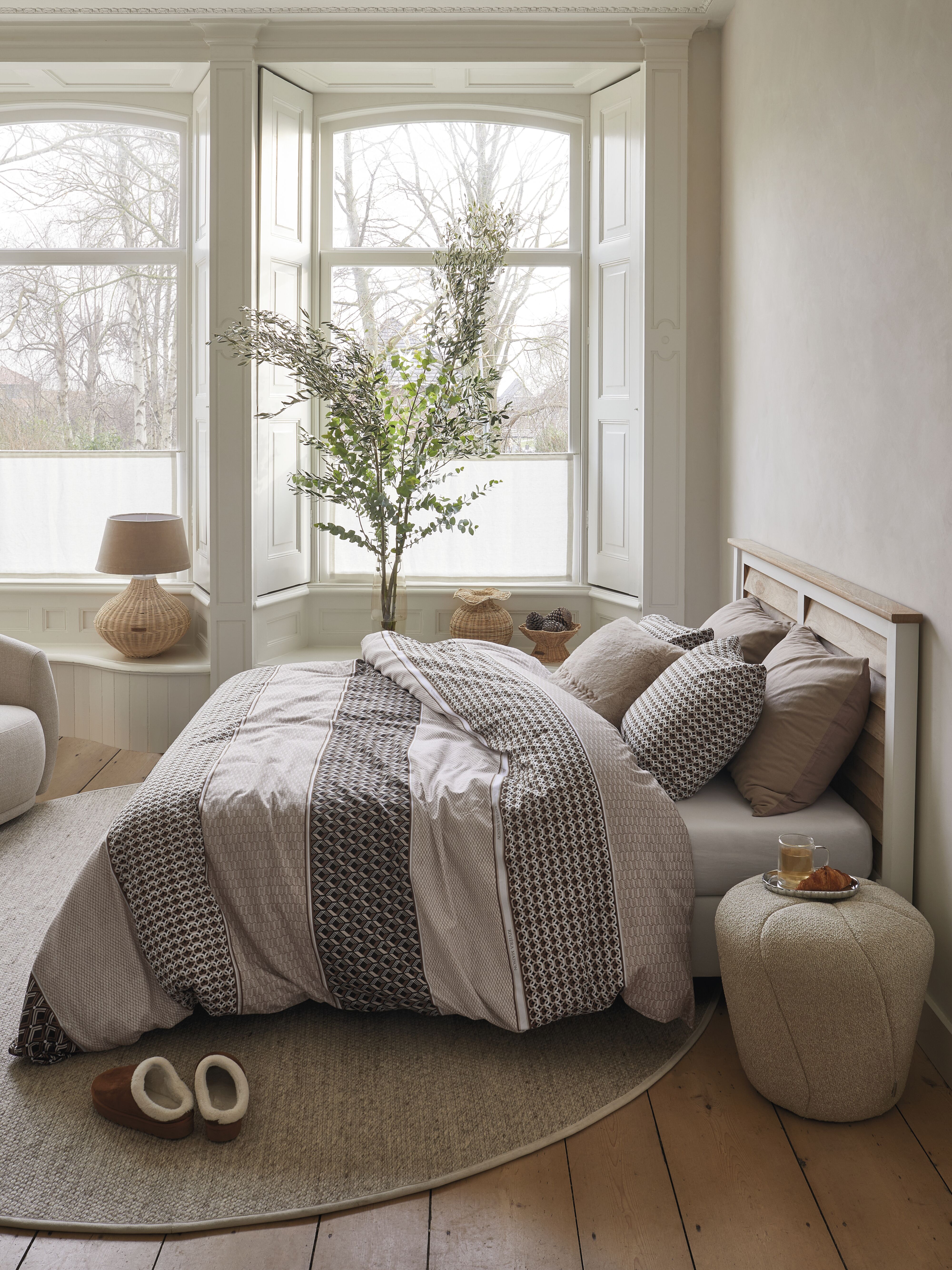 Dekbedovertrek Lawrence van Rivièra Maison heeft een print van een tijdloos banendessin, opgebouwd met verschillende weefmotieven en stofstructuren