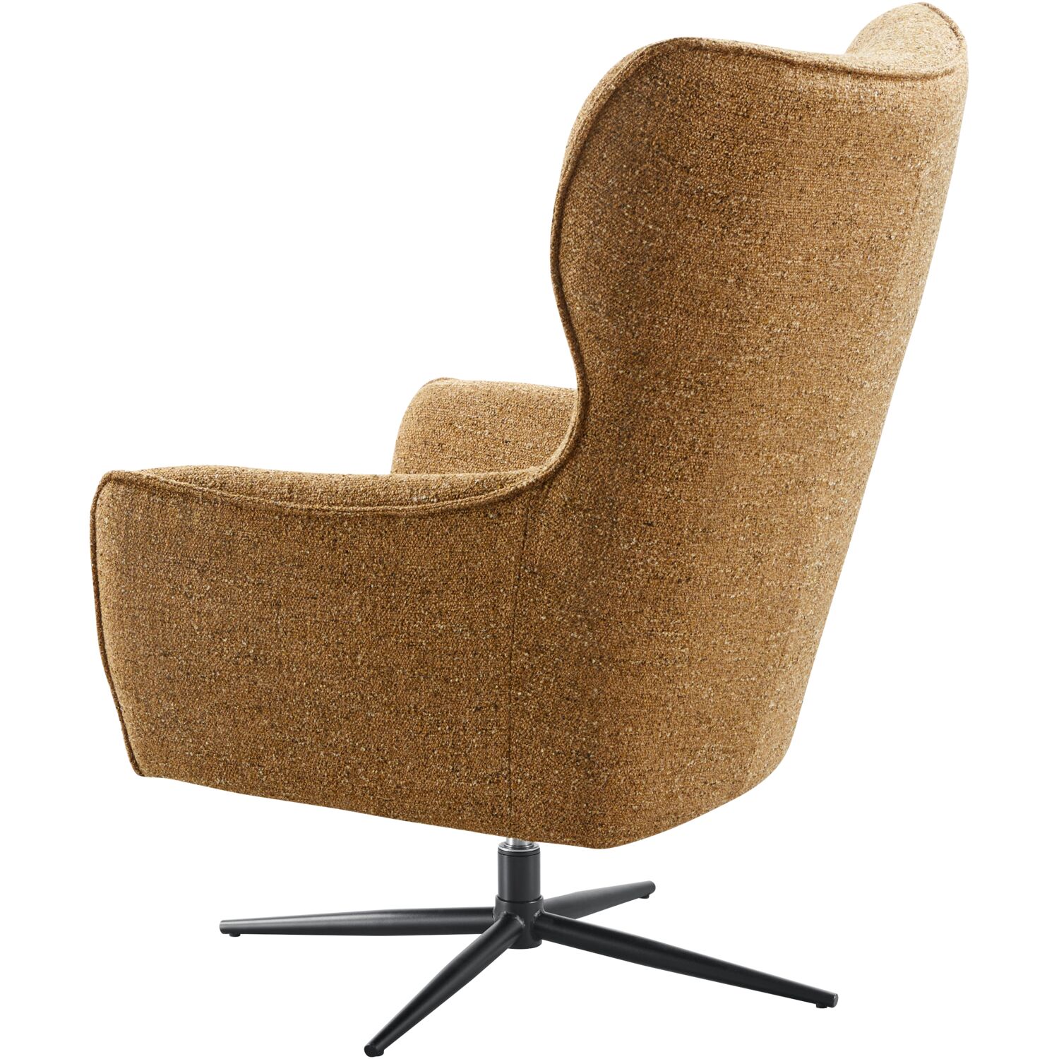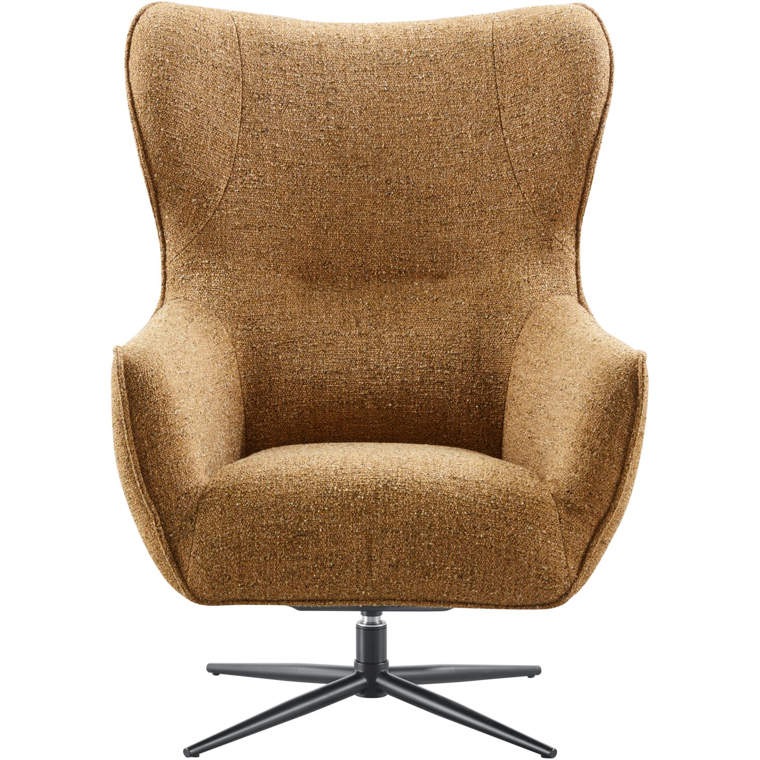 Draaifauteuil Plentia heeft een bijzondere vorm en is voorzien van mooie stiknaden en biezen. De okergele stof Be Amazing heeft een prachtig duo tone effect aangezien de stof geweven is met verschillende kleuren draad. Plentia heeft doorgestoffeerde armleuningen, een hoge rugleuning en een zwarte metalen draaipoot.