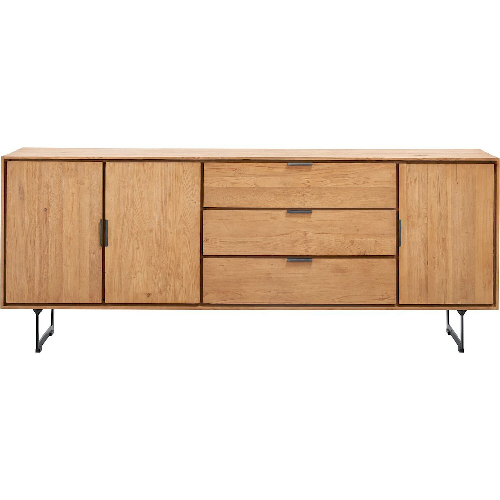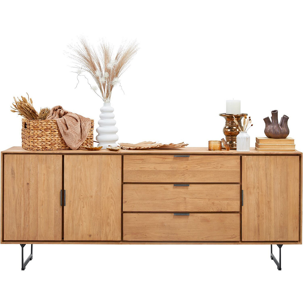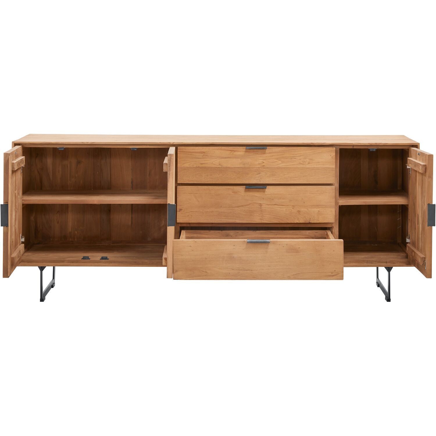 Dressoir Aska heeft een hoogte van 78 cm en een breedte van 195 cm. Met 3 ruime deuren en 3 handige laden biedt deze kast voldoende opbergruimte voor al je behoeften. Of je nu servies, tafellinnen, boeken of andere persoonlijke spullen wilt opbergen, deze kast heeft genoeg ruimte om alles netjes georganiseerd te houden. Achter de deuren vind je 1 vaste legplank. De kast wordt opgebouwd aangeleverd, waardoor je snel van je nieuwe meubelstuk kunt genieten. Je hoeft alleen het metalen frame te monteren, met de bijgesloten montagehandleiding is dit zo gebeurd.