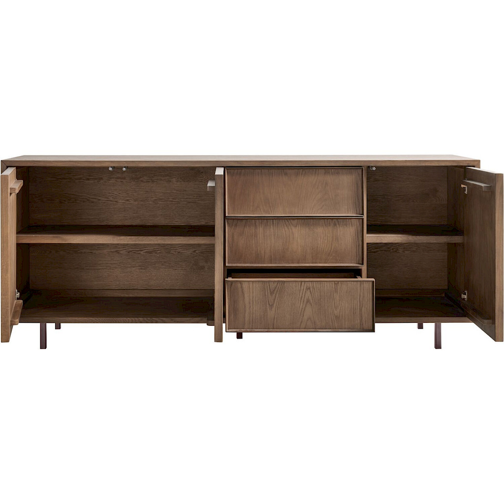 Met een hoogte van 80cm, breedte van 200cm en diepte van 45cm biedt dressoir Calvo veel opbergruimte. Achter de dubbele deur bevindt zich één brede plank, en achter de enkele deur één plank. De drie laden zijn ideaal voor kleinere items. Dankzij het push to open-systeem openen en sluiten de fronten eenvoudig met een lichte druk, wat het strakke design zonder handgrepen versterkt. Het dressoir wordt volledig gemonteerd geleverd, zodat je het direct kunt plaatsen en inrichten.