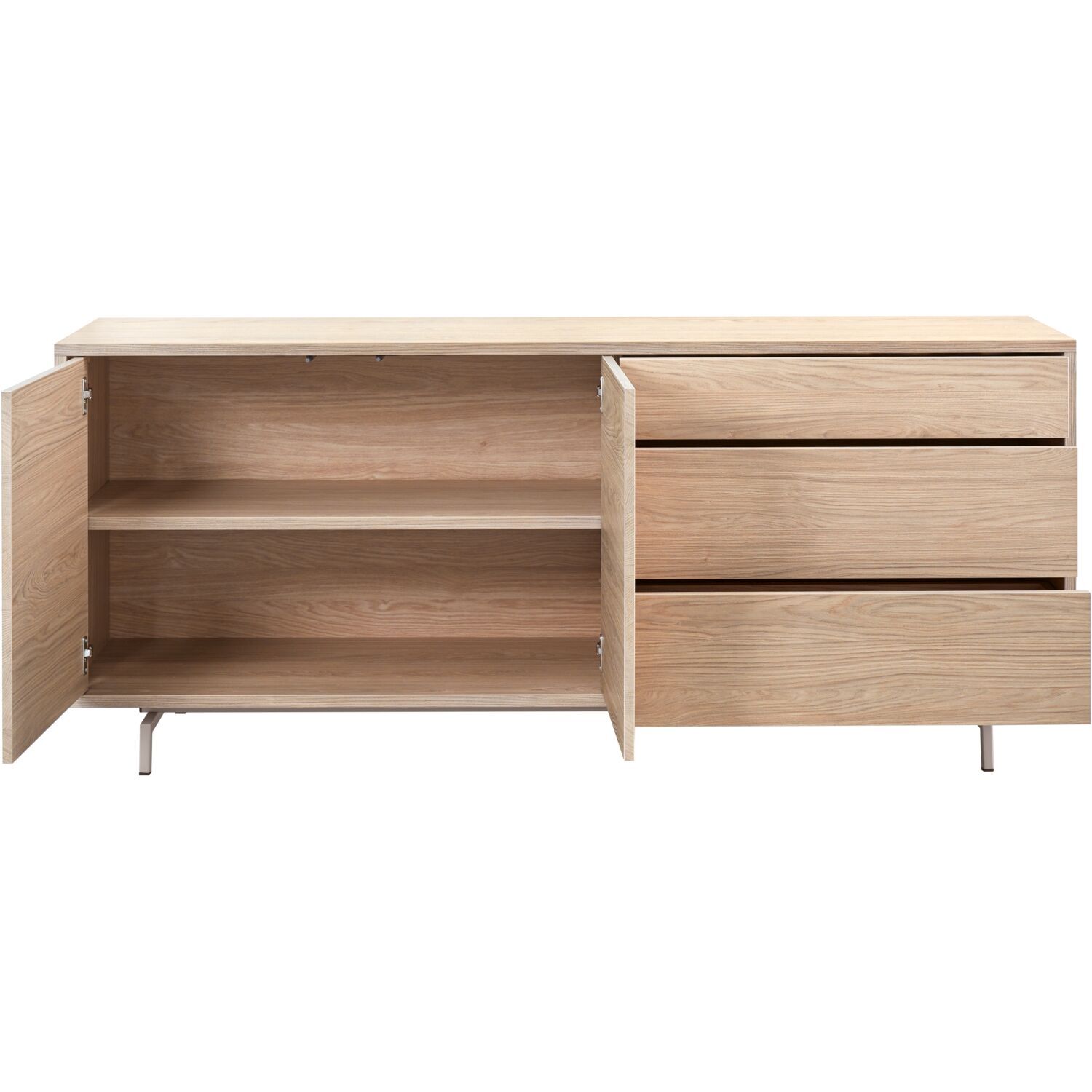 Met een hoogte van 76 cm, breedte van 228 cm en diepte van 45 cm is dit dressoir een praktische en stijlvolle toevoeging aan je interieur. Het heeft drie deuren en drie lades, elk met een legplank achter de deur. Dankzij het push to open systeem open je de lades en deuren eenvoudig met een lichte druk. De deuren zijn daarnaast voorzien van softclose, waardoor ze rustig openen en sluiten. Een klein duwtje bij het sluiten zorgt dat ze netjes dicht gaan. Het meubel wordt grotendeels gemonteerd geleverd; je hoeft alleen de poten nog te bevestigen.