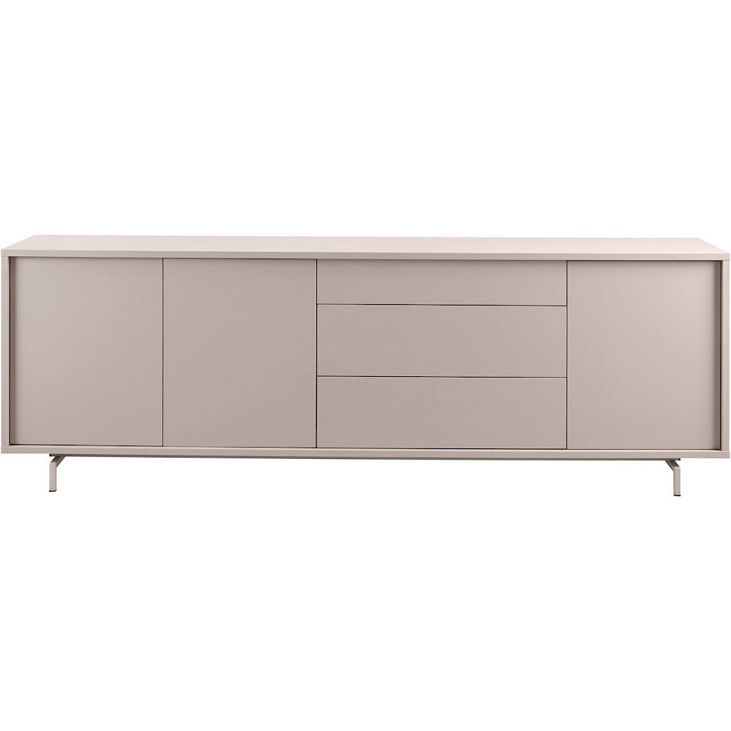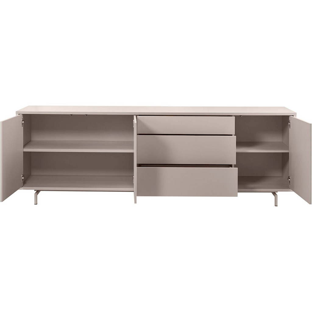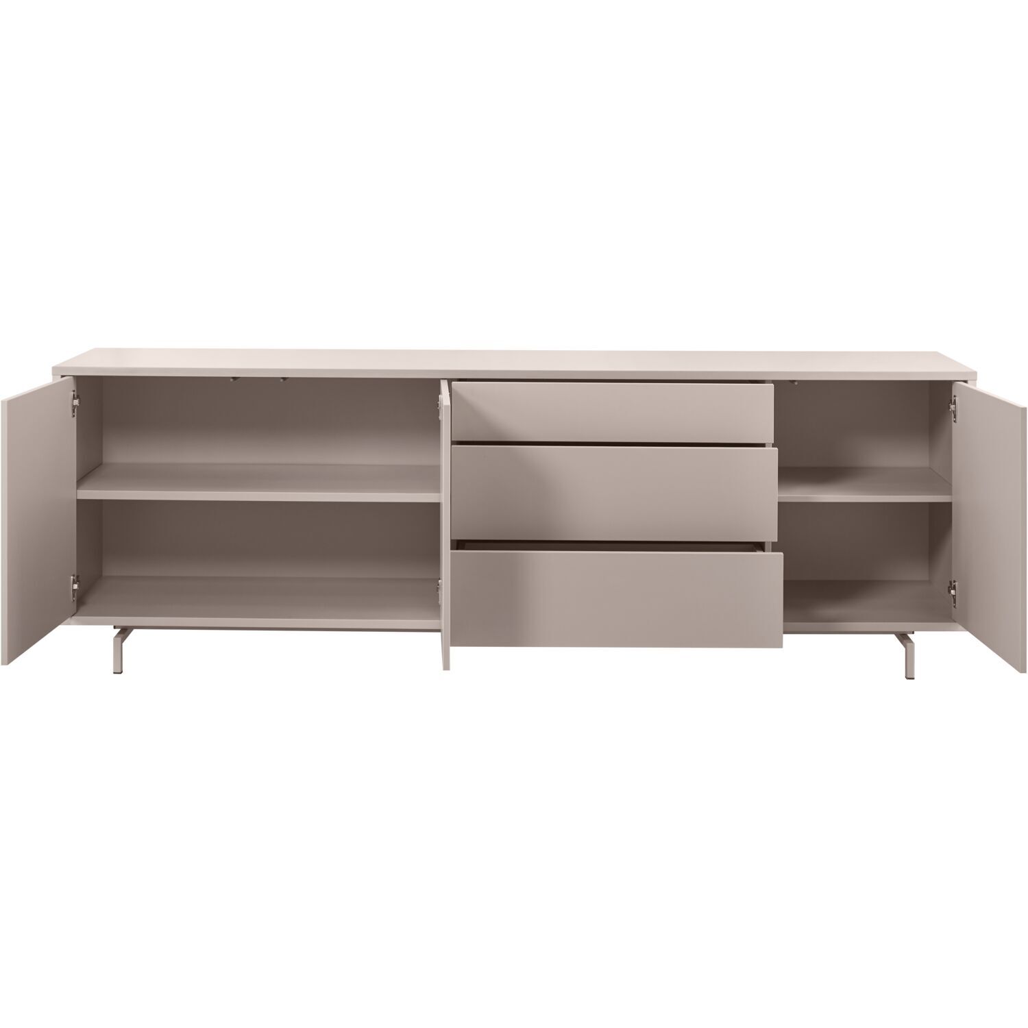Met een hoogte van 76 cm, breedte van 228 cm en diepte van 45 cm is dit dressoir een praktische en stijlvolle toevoeging aan je interieur. Het heeft drie deuren en drie lades, elk met een legplank achter de deur. Dankzij het push to open systeem open je de lades en deuren eenvoudig met een lichte druk. De deuren zijn daarnaast voorzien van softclose, waardoor ze rustig openen en sluiten. Een klein duwtje bij het sluiten zorgt dat ze netjes dicht gaan. Het meubel wordt grotendeels gemonteerd geleverd; je hoeft alleen de poten nog te bevestigen.