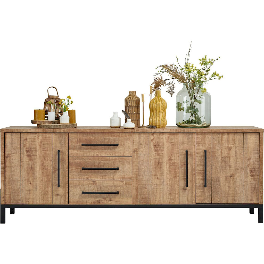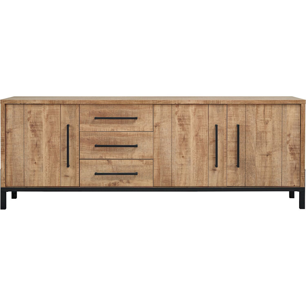 Uitgevoerd in melamine met mango decor in combinatie met zwart metalen frame, met 3 deuren en 3 laden.