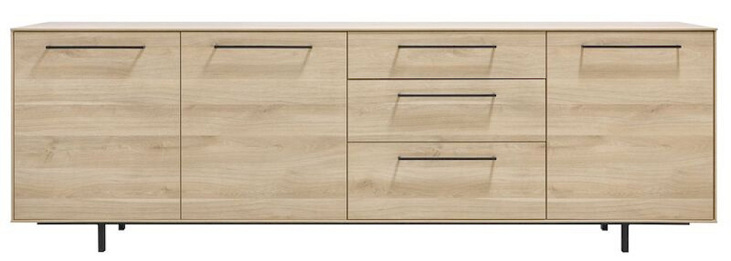 Uitgevoerd in melamine met fresh oak decor en zwarte metalen poten, met 3 deuren en 3 laden.