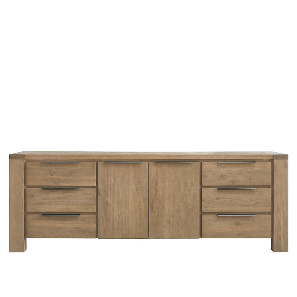 Dressoir Valvola geeft een warme, natuurlijke sfeer aan je interieur. Dit dressoir heeft 2 deuren en 6 laden en is afgewerkt met een beits en matglans lak in een warme, bruine kleur. De kast is 222 cm breed en 78 cm hoog. De lades zijn voorzien van een softclose systeem, waardoor deze automatisch zachtjes sluiten. Achter de deuren, die uitgevoerd zijn met een magneetsluiting, vind je een vaste legplank. Genoeg ruimte dus om je spullen in op te bergen. De slanke, metalen handgrepen vallen mooi in de bovenkant van de frontjes en geven het dressoir een stijlvol, modern accent.