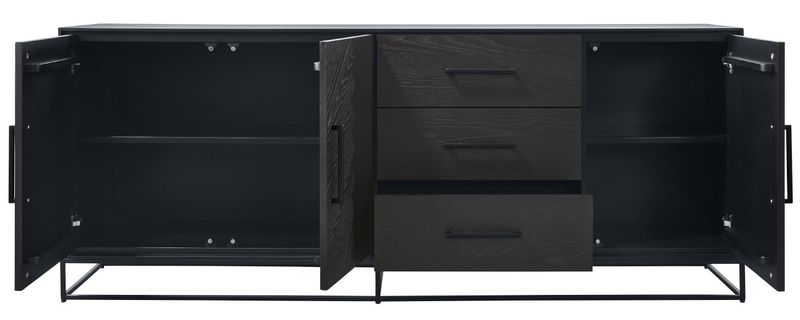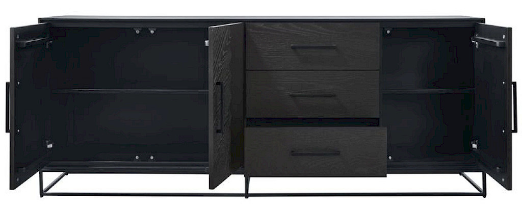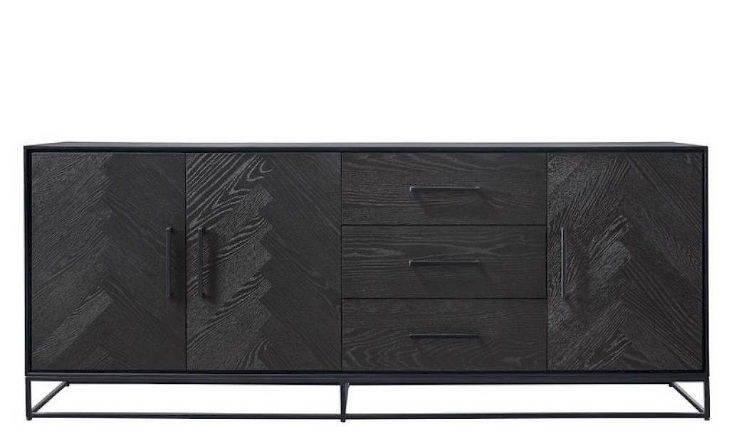 Industrieel zwart dressoir van eiken fineer met een zwarte romp en zwarte metalen poten. De afmetingen zijn H79xB199xD42cm. De dressoir beschikt over 3 deuren met een visgraat motief en 3 laden om spullen niet-zichtbaar in op te bergen. De poten en het frame zijn in zwart metaal uitgevoerd. Handig om te weten dat je het meubel niet hoeft te monteren. Dit hebben wij al voor je gedaan. Daarnaast is het dressoir ook leverbaar in de kleur naturel.