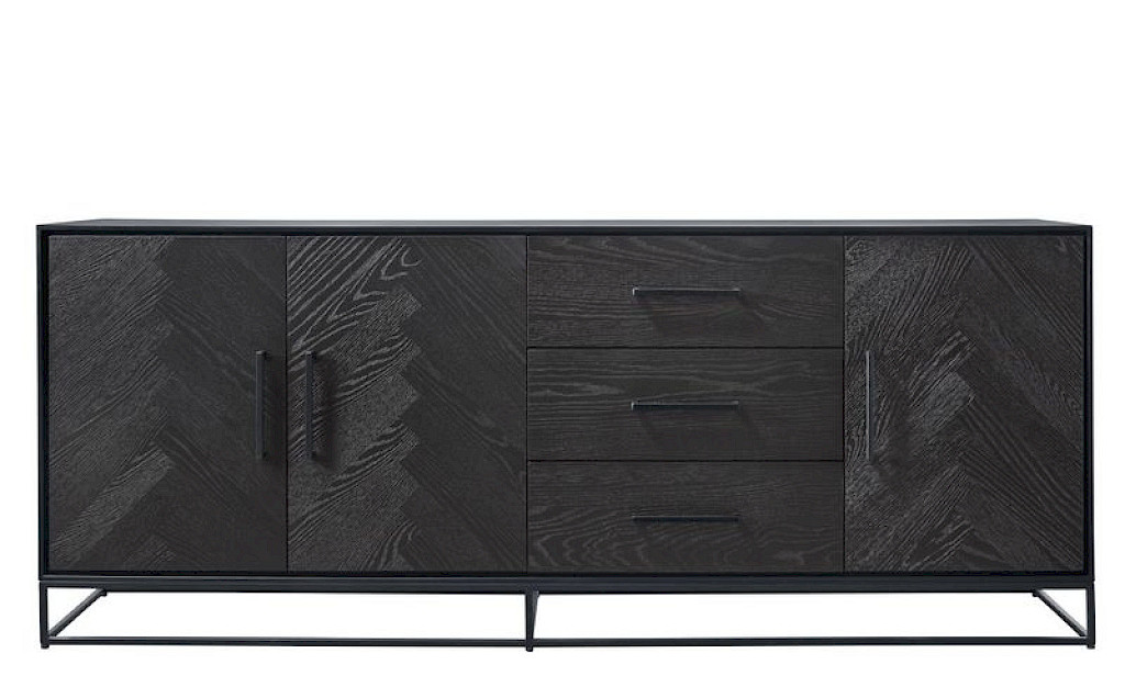 Uitgevoerd in zwart eiken fineer met visgraat motiefl. 3 deuren en 3 laden.