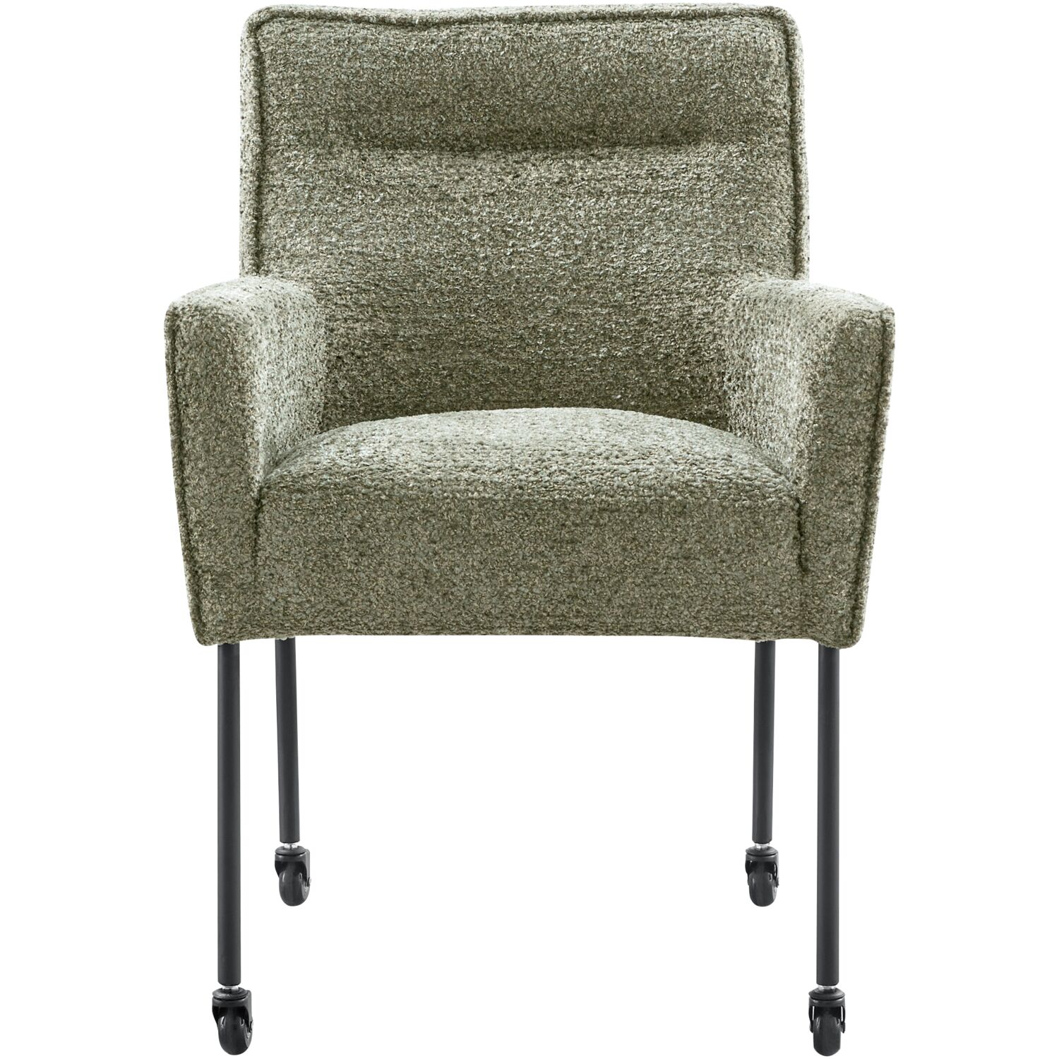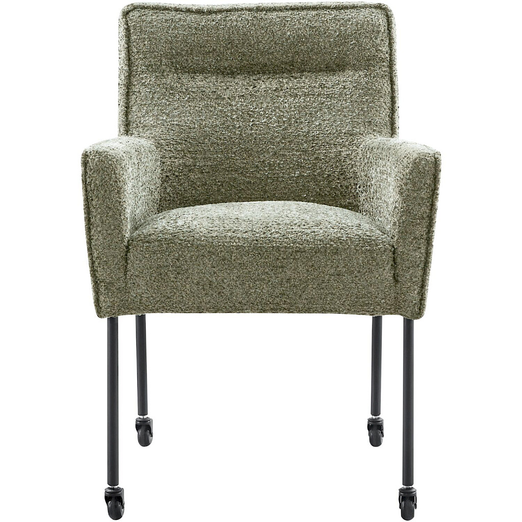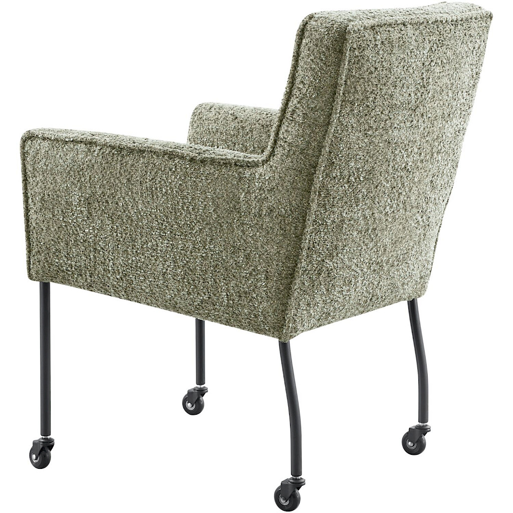 Model Caritas in kleur groen is voorzien van zwarte metalen poten met skatewielen en een armleuning wat de stoel een stoere uitstraling geeft. De stiknaad in de rugleuning geeft dit model een eigen karakter. Caritas beschikt over een stalen nosagvering gecombineerd met HR-schuim in de zitting om je een optimaal zitcomfort te bieden.