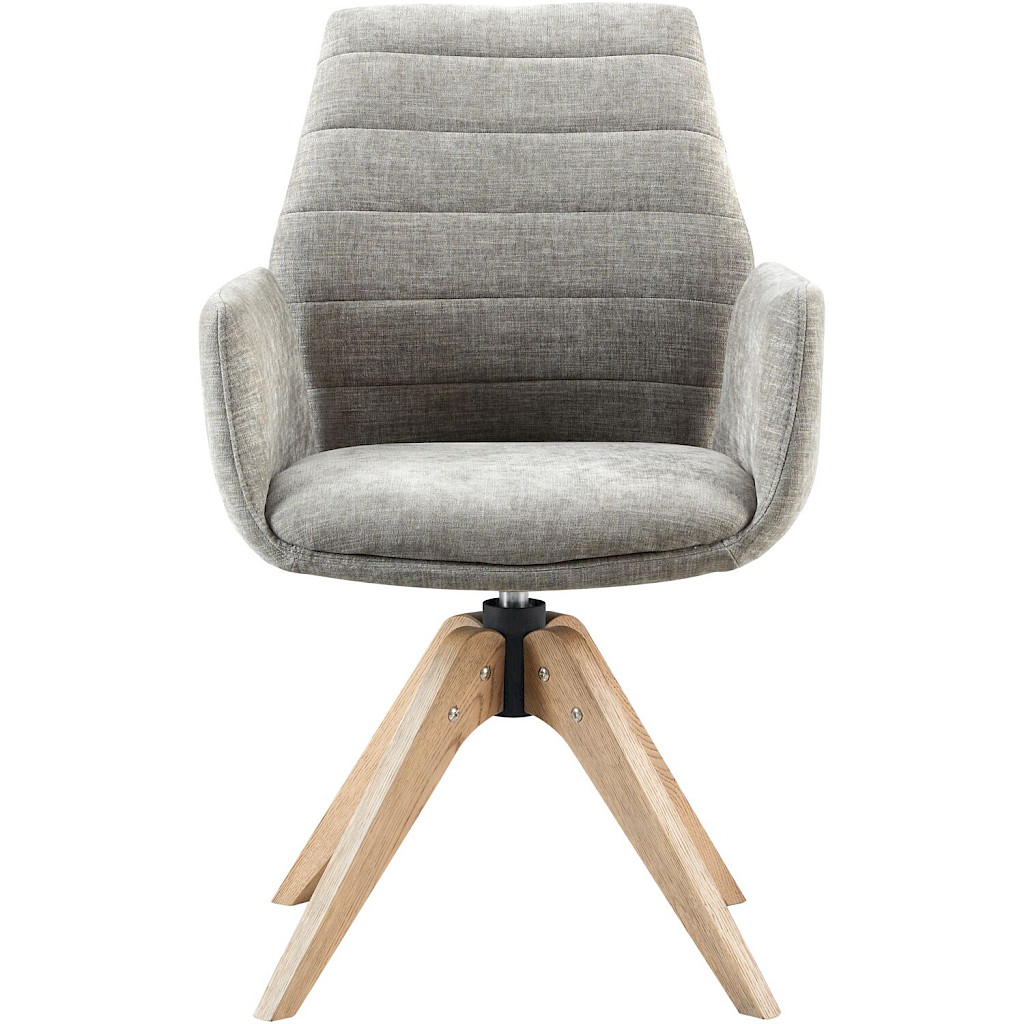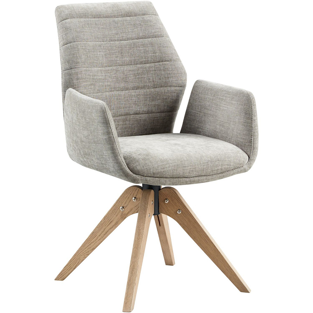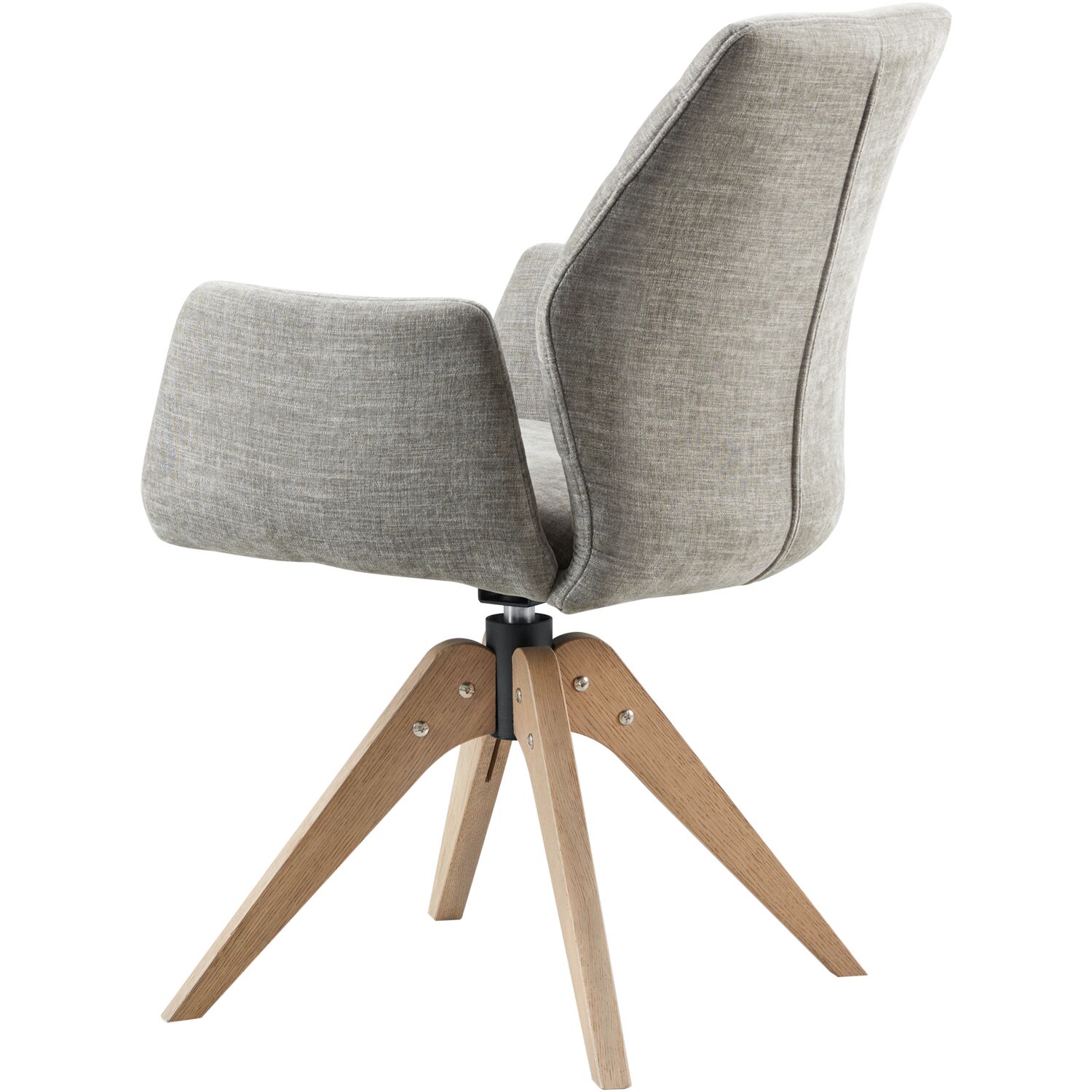 Armstoel Dayla kent vele mogelijkheden. Met zijn mooie vormen is dit model een echte eye-catcher voor aan je eettafel. Of je nu een stoel wenst met of zonder armleuning, met metalen of een eikenhouten onderstellen. Alles is mogelijk! Deze eetkamerstoel is uitgevoerd in een grijze stof met een mooi horizontaal stikselmotief op de rugleuning en een eikenhouten draaipoot.