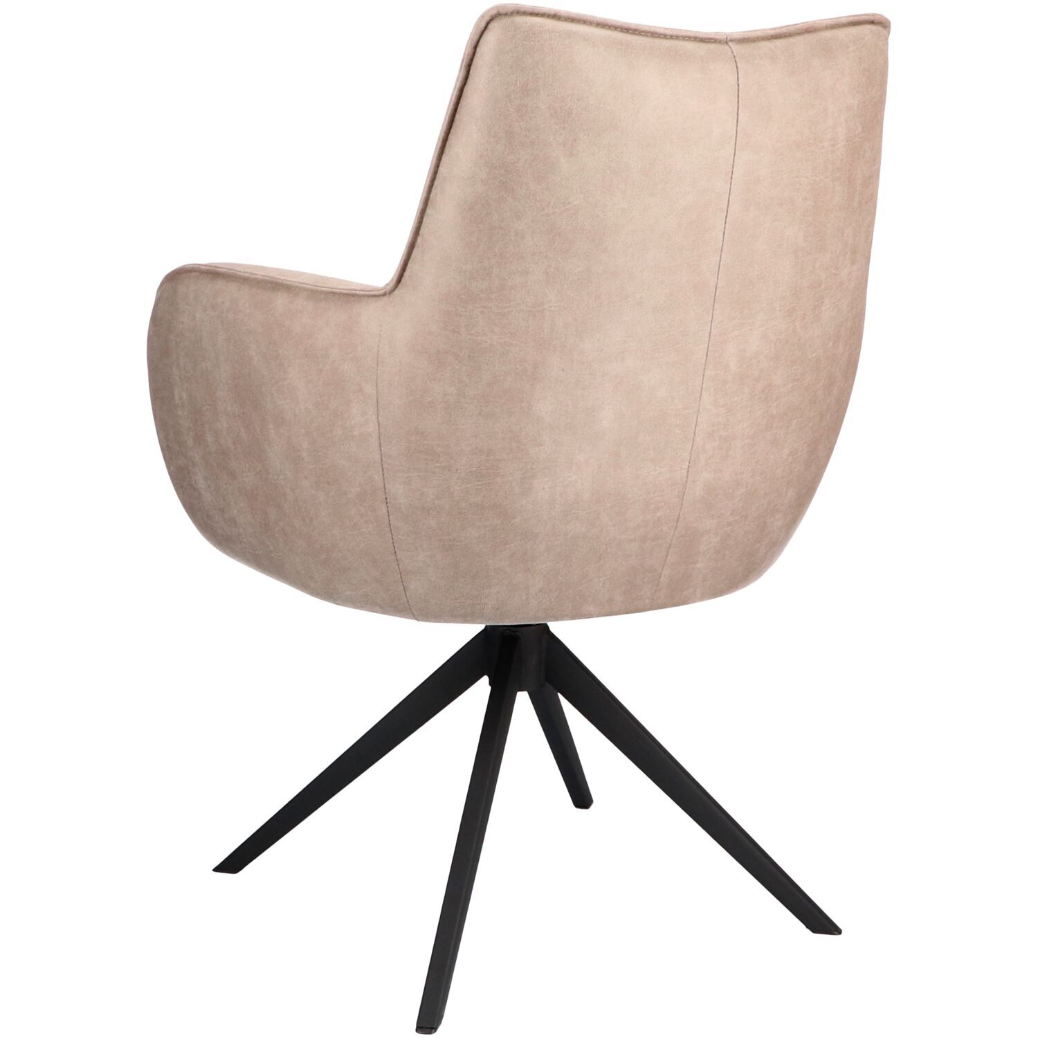 De armstoel Dordona is een comfortabele en moderne toevoeging aan de eetkamer. De stoel is uitgevoerd in een zachte microlederstof in een warme beige-groene tint. Deze stof voelt fluweelzacht aan, heeft een luxe uitstraling en is tegelijkertijd slijtvast en onderhoudsvriendelijk. De afgeronde armleuningen en de zwarte metalen draaipoot geven de Dordona een eigentijdse look. Dankzij de prettig gevormde kuip en de vaste kussens in rug en zitting biedt de stoel optimaal zitcomfort, ook tijdens lange avonden aan tafel.