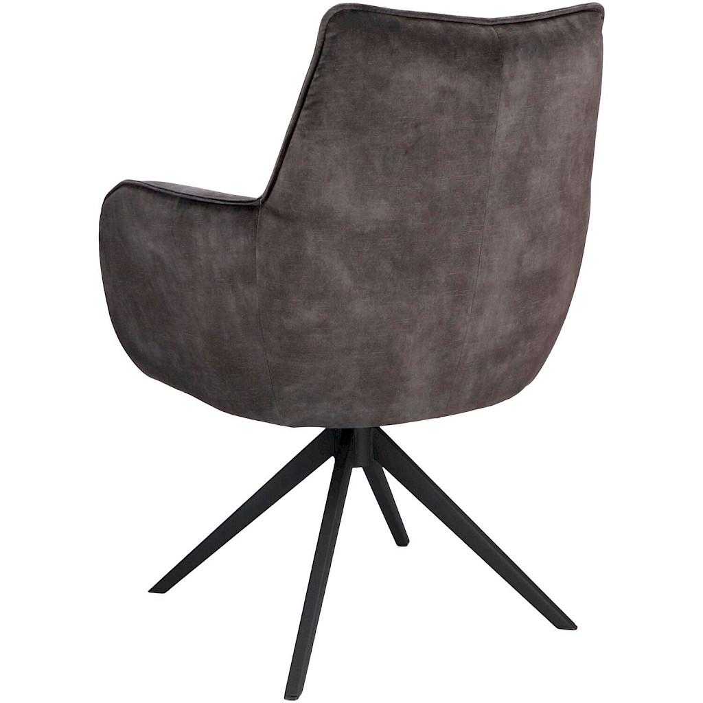 De armstoel Dordona is een comfortabele en moderne toevoeging aan de eetkamer. De stoel is uitgevoerd in een zachte velvetstof in een grijs-groene tint. Deze stof voelt fluweelzacht aan, heeft een luxe uitstraling en is tegelijk slijtvast en onderhoudsvriendelijk. De afgeronde armleuningen en de zwarte metalen draaipoot geven de Dordona een eigentijdse look. Dankzij de prettig gevormde kuip en de vaste kussens in rug en zitting biedt de stoel optimaal zitcomfort, ook tijdens lange avonden aan tafel.