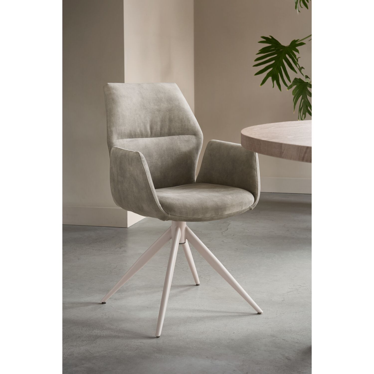 Eetkamerstoel Faido is de perfecte keuze voor wie op zoek is naar een comfortabele stoel met een tijdloze uitstraling. De stoel is bekleed met een lichtbeige velvetstof met een grijze ondertoon. De stof heeft rechtopstaande, korte vezels die, afhankelijk van de lichtinval en door over de stof te wrijven, lichter of donkerder van kleur lijken. De teruggetrokken naad op de rugleuning geeft de stoel een verfijnde uitstraling, terwijl de taupegrijze metalen poten zorgen voor een stijlvolle en perfecte match met de bekleding.