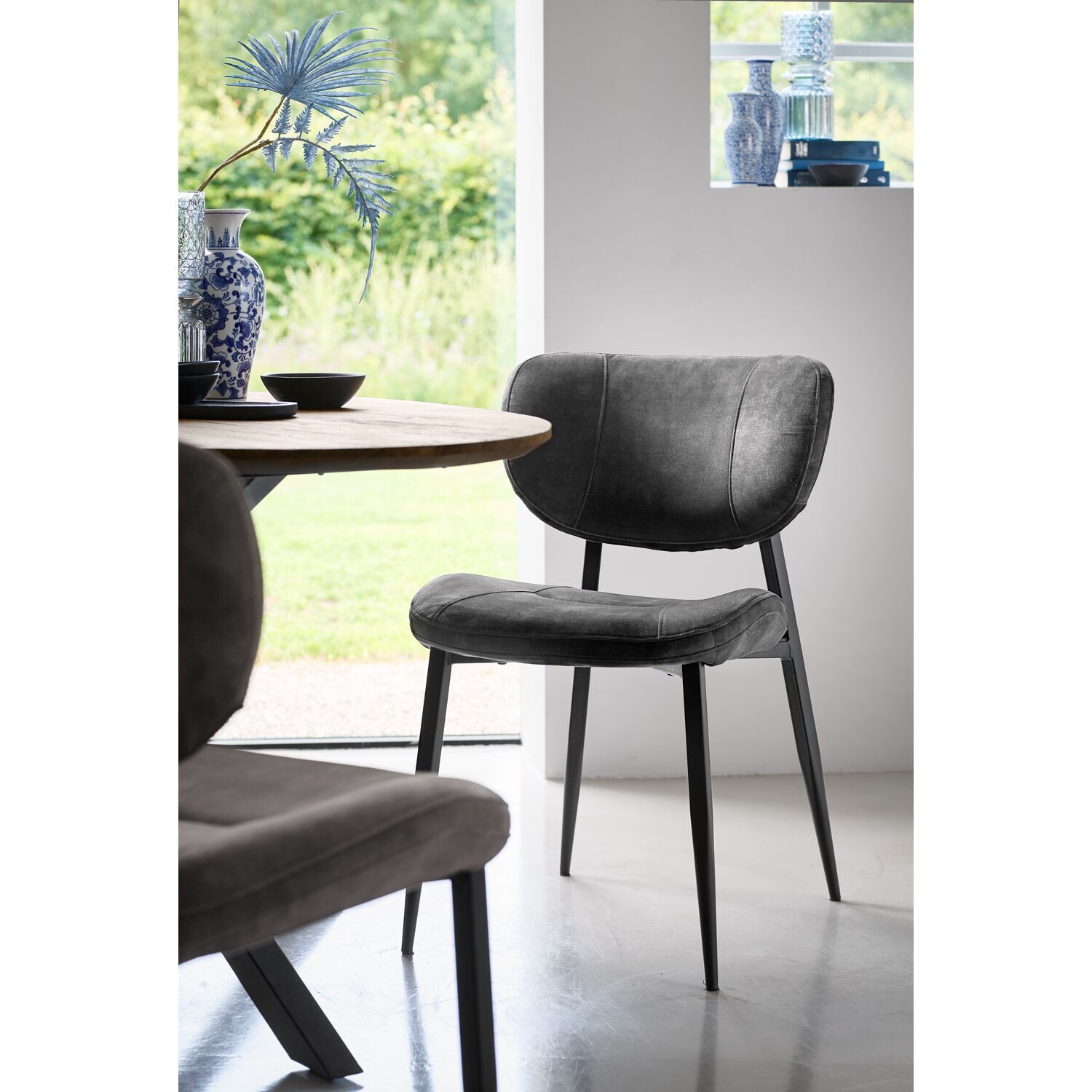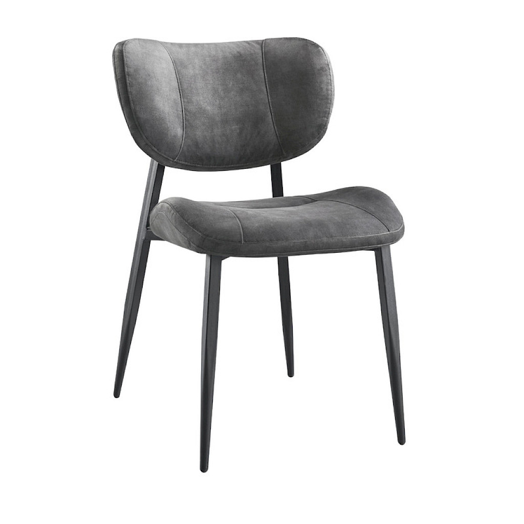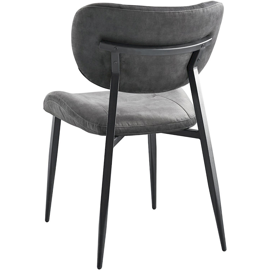 Eetkamerstoel Gomba combineert een tijdloze uitstraling met een luchtig design. Dankzij de open rug krijgt de stoel een speelse uitstraling en oogt de eethoek minder massief. Uitgevoerd in een zachte velvetstof in antraciet geeft het ontwerp een moderne en chique uitstraling. De stof heeft korte, rechtopstaande vezels die zorgen voor een subtiele vleug: afhankelijk van de lichtinval lijkt de kleur lichter of donkerder. Velvet voelt luxe en zacht aan, terwijl het ook onderhoudsvriendelijk is. De sierstiksels op zowel de rugleuning als de zitting accentueren de licht rond lopende vormen, terwijl het zwarte metalen frame de stoel een stoere uitstraling en stevige basis geeft.