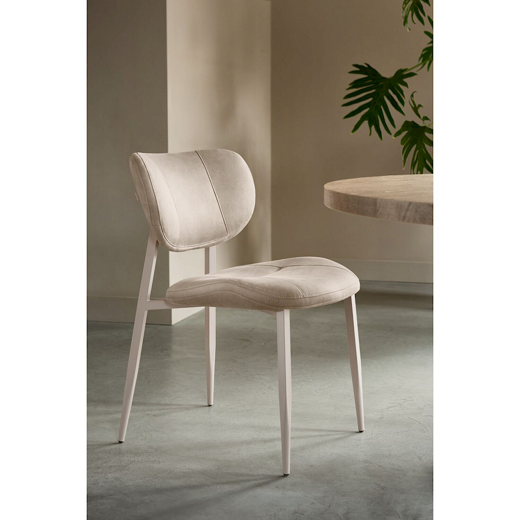 Eetkamerstoel Gomba combineert een tijdloze uitstraling met een luchtig design. Dankzij de open rug krijgt de stoel een speelse uitstraling en oogt de eethoek minder massief. Uitgevoerd in een zachte microvezel in een beige tint met grijze ondertoon straalt het ontwerp warmte en elegantie uit. De stof voelt prettig aan, is slijtvast en staat bekend om zijn onderhoudsvriendelijke eigenschappen. De sierstiksels op zowel de rugleuning als de zitting accentueren de licht rond lopende vormen, terwijl het taupegrijze metalen frame zorgt voor een stijlvolle en perfecte match met de stof.