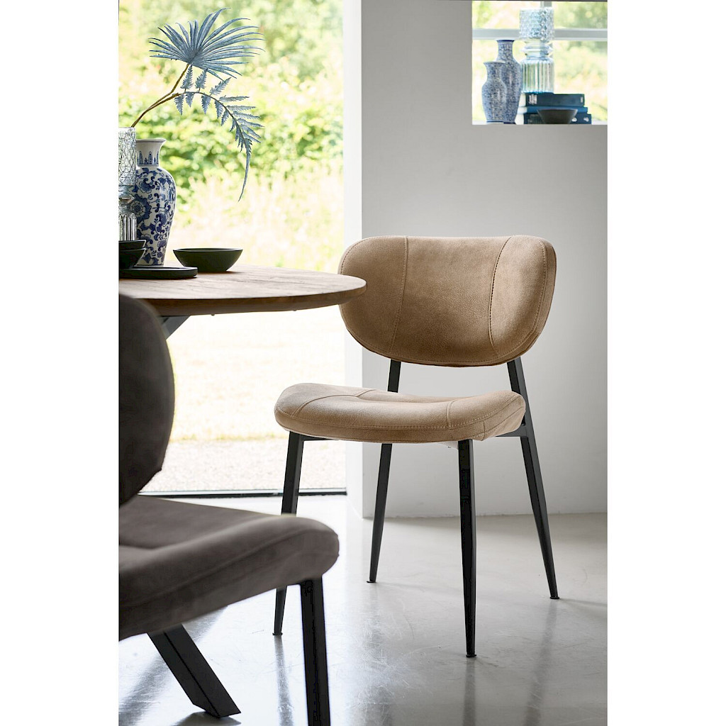 Eetkamerstoel Gomba combineert een tijdloze uitstraling met een luchtig design. Dankzij de open rug krijgt de stoel een speelse uitstraling en oogt de eethoek minder massief. Uitgevoerd in een zachte microvezel in taupe zorgt het ontwerp voor een warme en veelzijdige uitstraling. De stof voelt prettig aan, is slijtvast en staat bekend om zijn onderhoudsvriendelijke eigenschappen. De sierstiksels op zowel de rugleuning als de zitting accentueren de licht rond lopende vormen, terwijl het zwarte metalen frame de stoel een stoere uitstraling en stevige basis geeft.