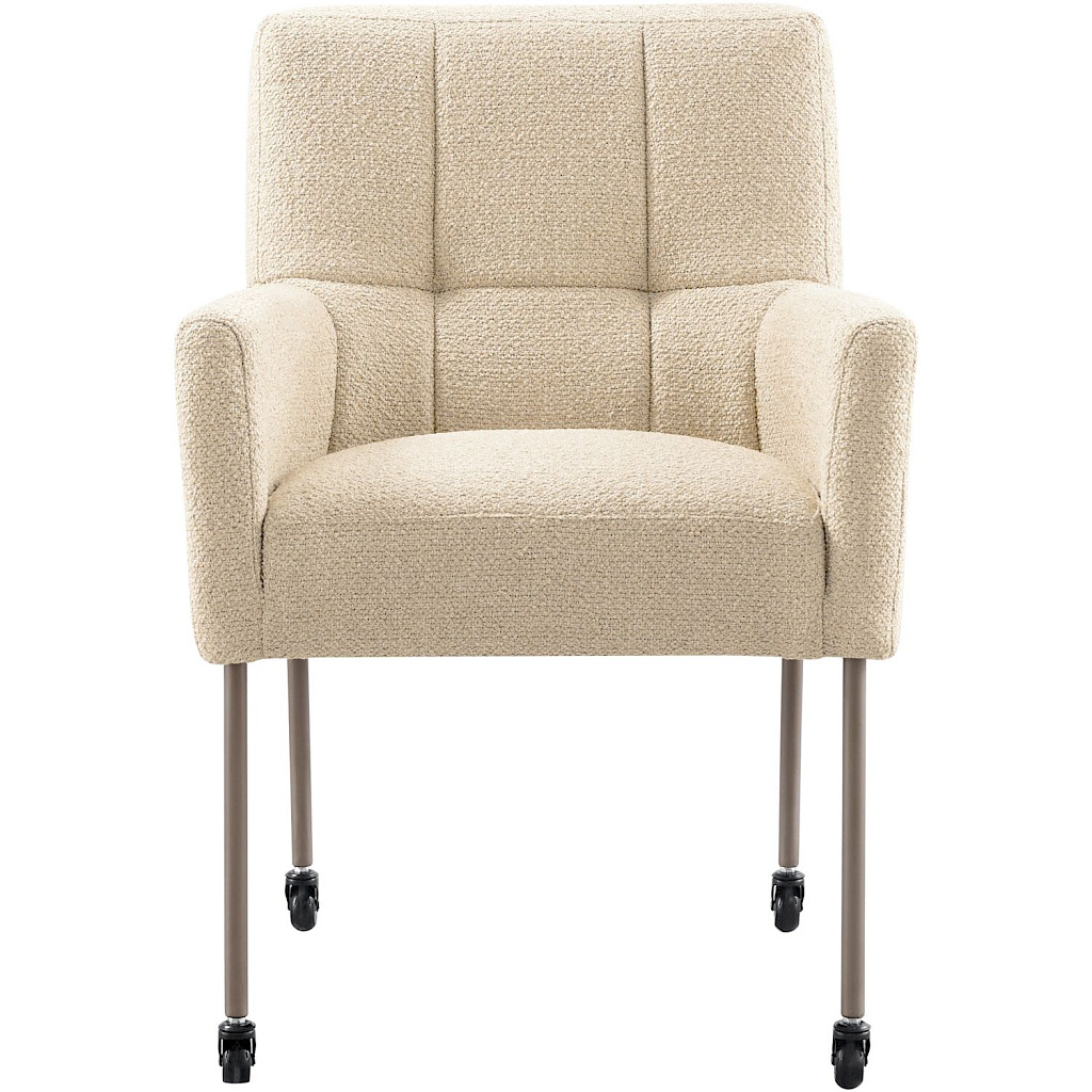 Stoel Janinto heeft een elegante uitstraling door de volle rug en zitting, de champagne kleurige poten met skatewielen en het stiksel in de rug. Model Janinto heeft een stalen nosagvering gecombineerd met HR-schuim in de zitting om je een optimaal zitcomfort te bieden. Heerlijk om uitgebreid te tafelen, maar Janinto leent zich ook uitstekend om bij je zithoek te plaatsen als je visite krijgt.