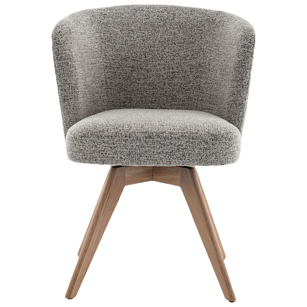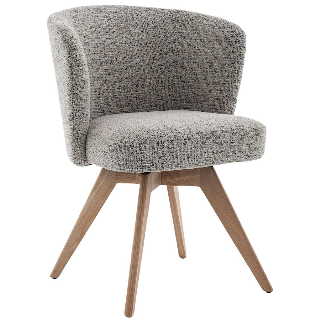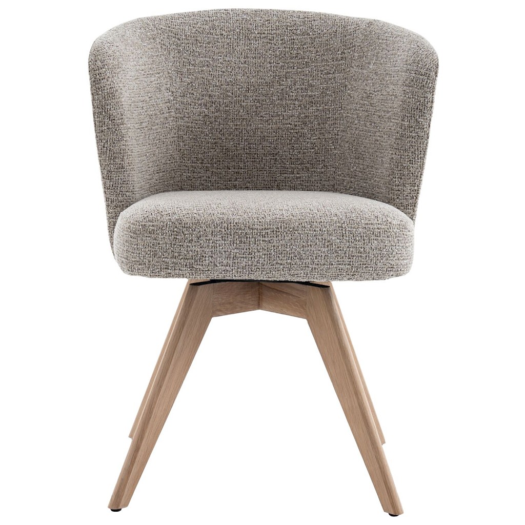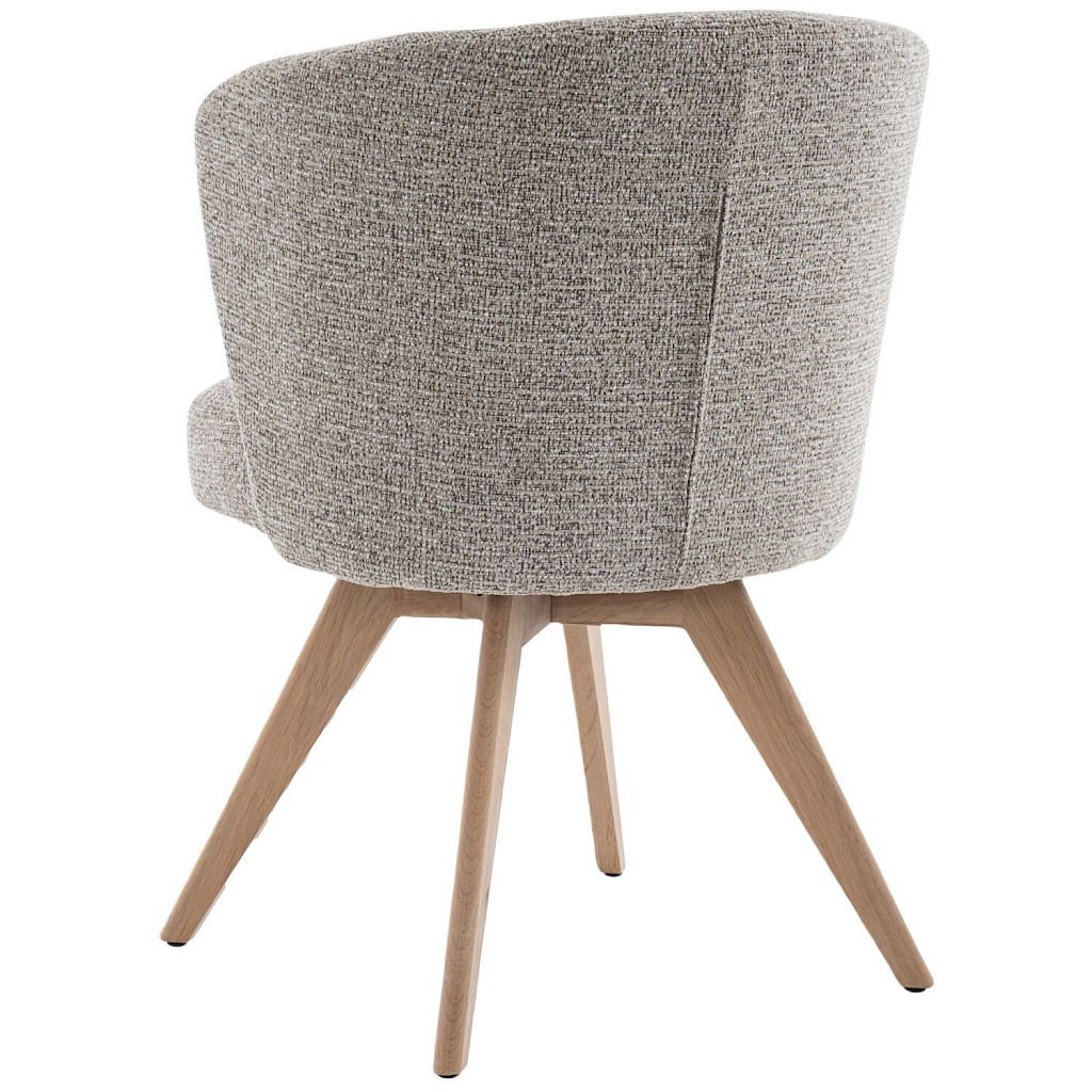 Armstoel Mandolia is met zijn trendy afgeronde vorm een echte eye-catcher voor aan je eettafel. Deze moderne eetkamerstoel is uitgevoerd in een mooie taupe kleurige weefstof en een draaibaar massief eiken onderstel inclusief terugdraaimechanisme. Hierdoor zal de stoel altijd weer naar zijn oorspronkelijke positie terugdraaien.