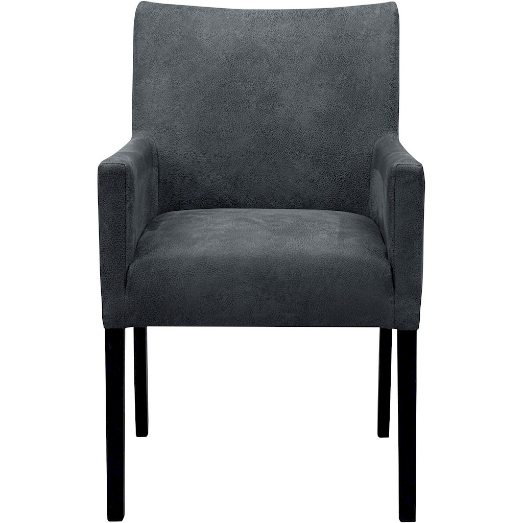 Armstoel Avanza heeft een krachtige, moderne uitstraling. De stoel is bekleed met donkergrijs microleder: een samengestelde bekleding van leder en textiel. Het combineert de luxe uitstraling van leer met het comfort en onderhoudsgemak van stof. De matte structuur en de diepe kleur geven de stoel een stoere, stijlvolle look. De zwarte houten poten zorgen voor een strak en rustig contrast. De poten zijn al gemonteerd, dus de stoel is direct klaar voor gebruik.