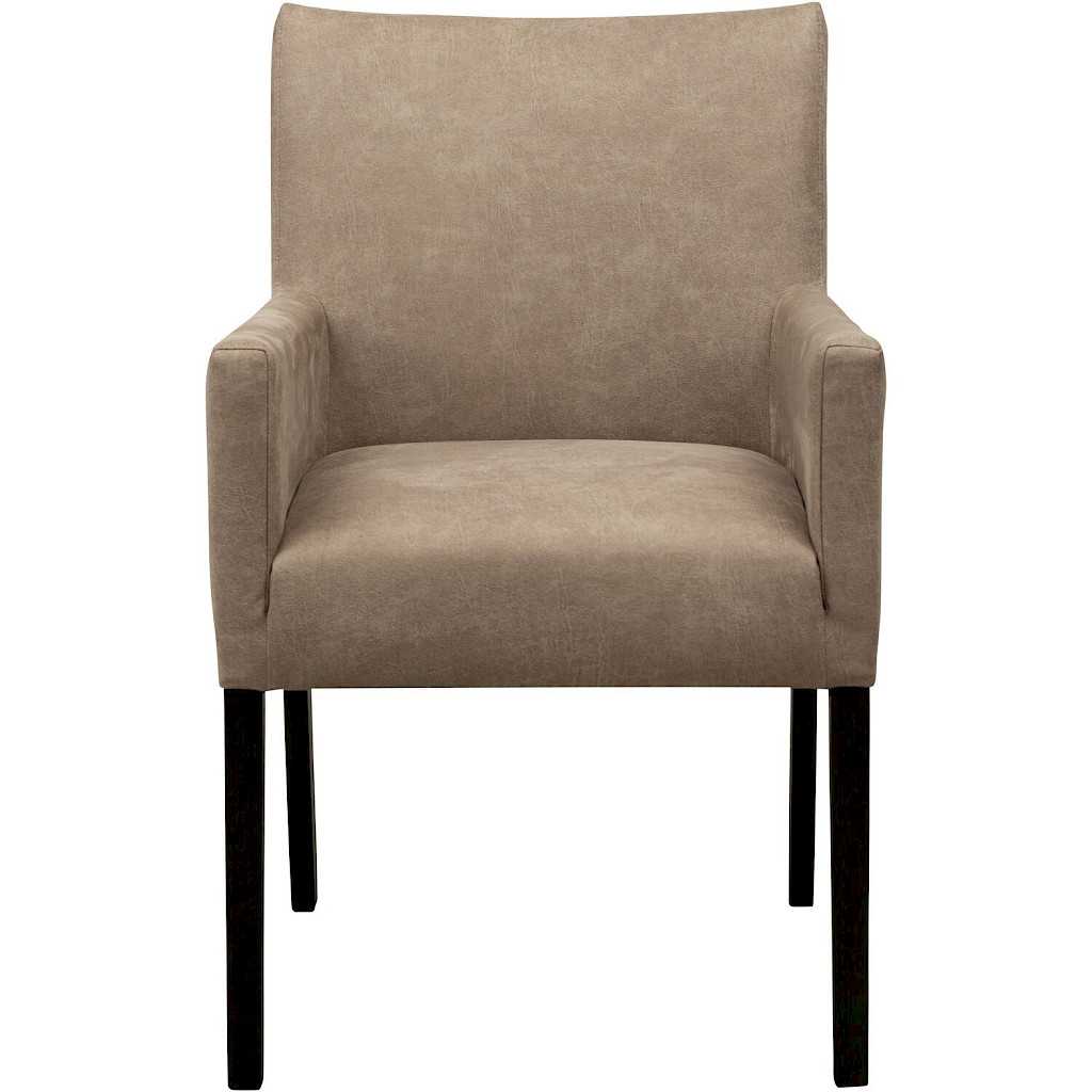 Armstoel Avanza is bekleed met microleder in een grijs-beige kleur. Deze bekleding heeft een grovere, robuuste uitstraling met een duidelijke structuur die doet denken aan rundleer. De stof voelt wat steviger aan en heeft een meer lederachtige grip dan zachtere microledervarianten. De matte afwerking en stoere look maken deze stoel een perfecte match voor industriële of landelijke interieurs. De zwarte houten poten zorgen voor een strak en rustig contrast. De poten zijn al gemonteerd, dus de stoel is direct klaar voor gebruik.