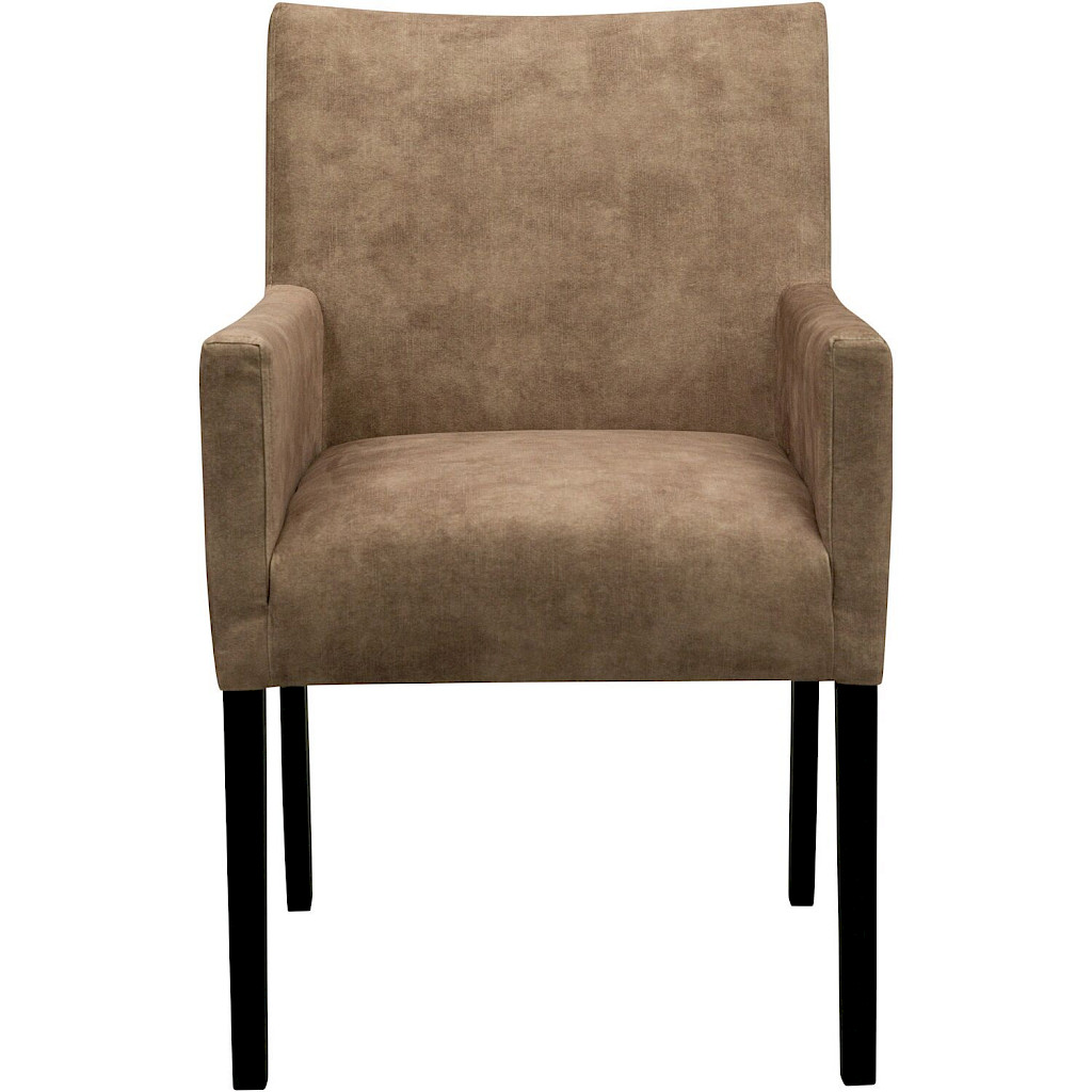 Armstoel Avanza is bekleed met een luxueuze beige veloursstof. Deze hoogwaardige stof voelt heerlijk zacht aan en heeft een rijke uitstraling. Dankzij de vezelstructuur ontstaat een subtiel schaduweffect dat mee verandert met de lichtinval, wat zorgt voor een levendig en warm karakter. De zwarte houten poten maken de stoel helemaal af en geven hem een moderne, strakke uitstraling. De poten zijn al gemonteerd, dus de stoel is direct klaar voor gebruik.