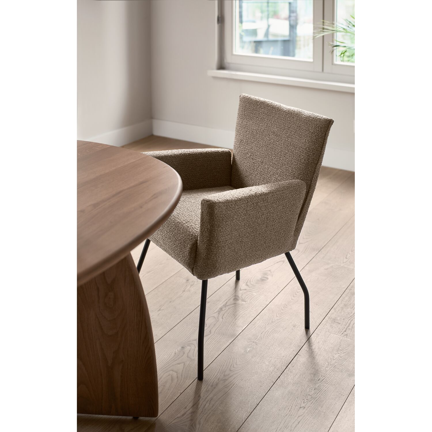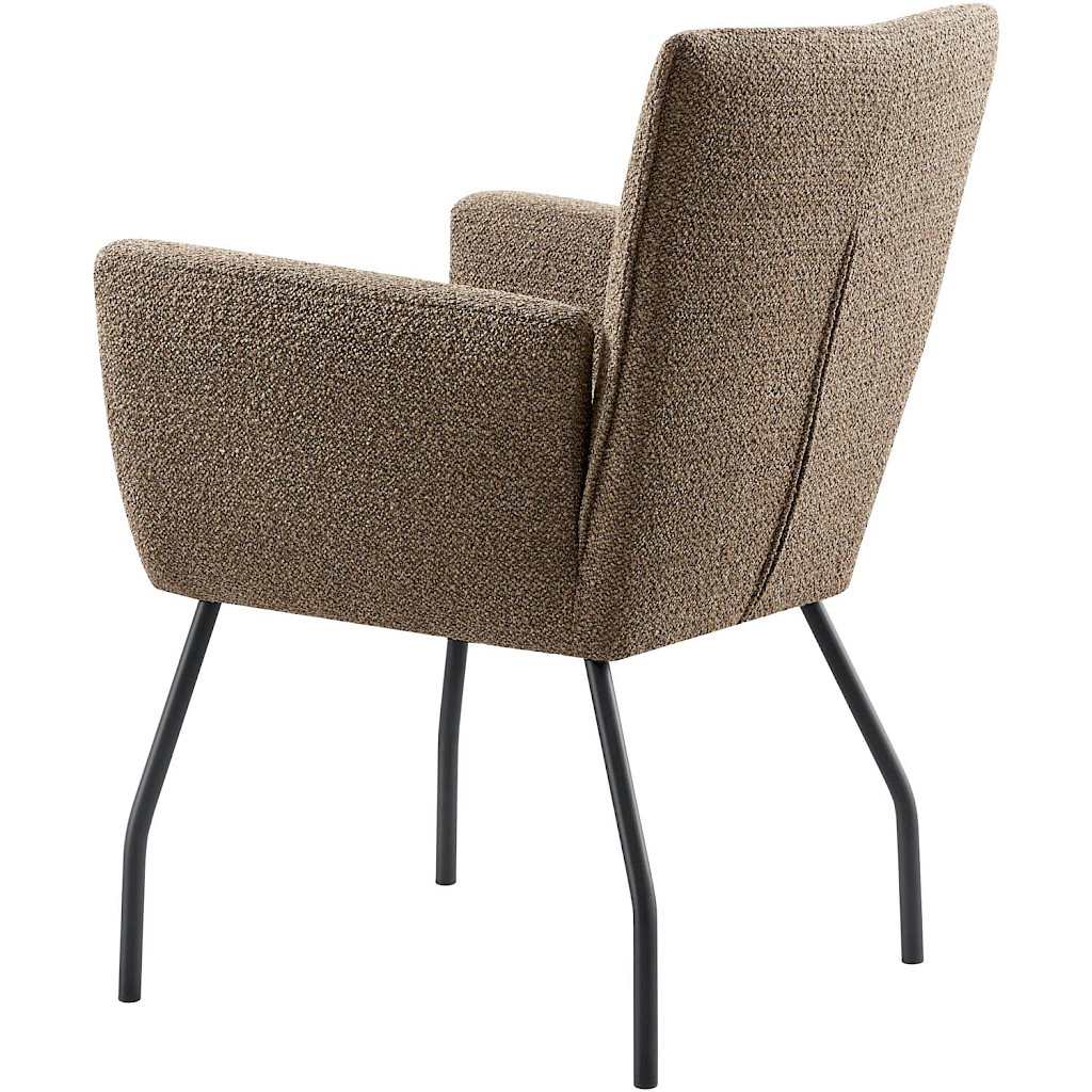 Eetkamerstoel Rantio met armleuning heeft een stoere uitstraling door het gebruik van een mooie bruine stof, zwarte metalen poten en een trekstrook op de rugleuning. Deze eetkamerstoel biedt een uitstekend zitcomfort en is erg geschikt voor een heerlijk avondje tafelen met vrienden of familie.