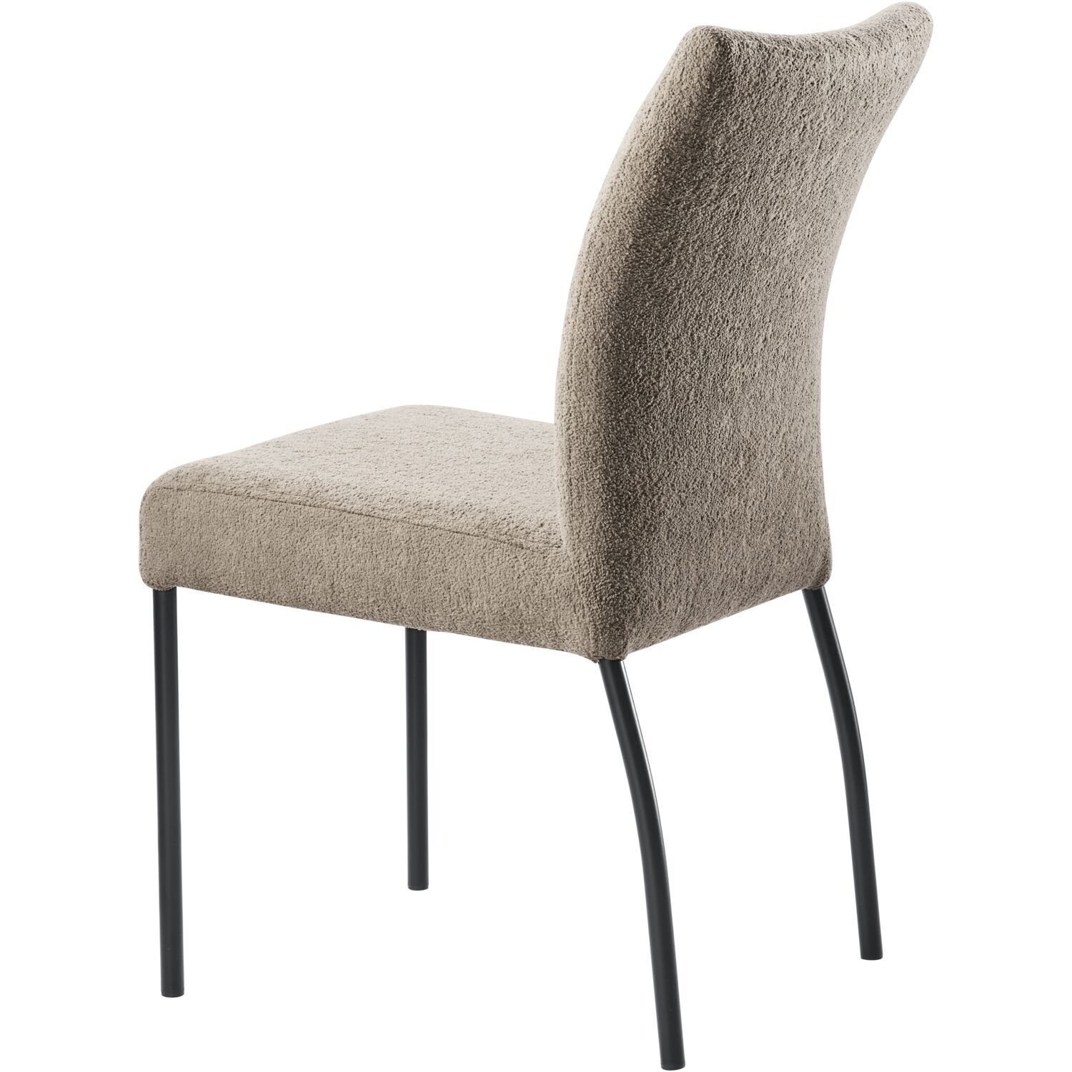 Sessione is een ranke eetkamerstoel met een elegante uitstraling. De stoel is bekleed met een beige-grijs-groene teddystof die ontzettend zacht aanvoelt.