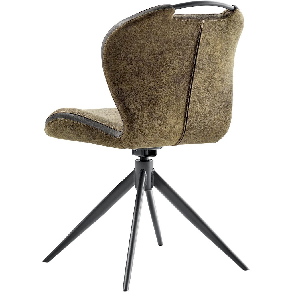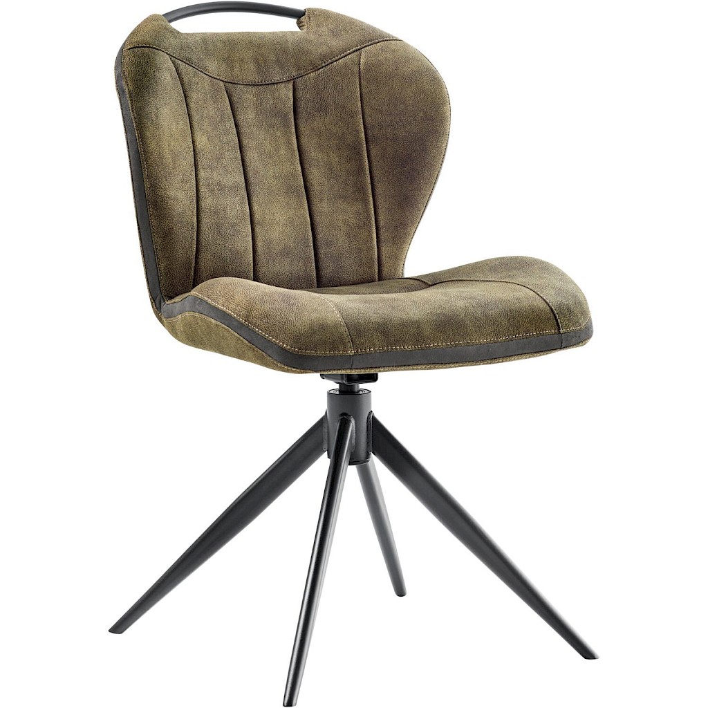 De Tantini-eetstoel is bekleed met microvezel in een groene tint, die zacht aanvoelt en makkelijk te onderhouden is. Het retrostiksel en de accentband geven een subtiel contrast en benadrukken de karaktervolle vorm van de rug. De zitting en rug vormen één comfortabel geheel, terwijl de handgreep bovenaan de rugleuning het verplaatsen van de stoel gemakkelijk maakt. Het zwarte metalen onderstel biedt extra stevigheid en stabiliteit. Dankzij de draaifunctie met autoreturn kun je de stoel soepel in alle richtingen draaien, terwijl hij automatisch terugdraait naar de uitgangspositie wanneer je opstaat.